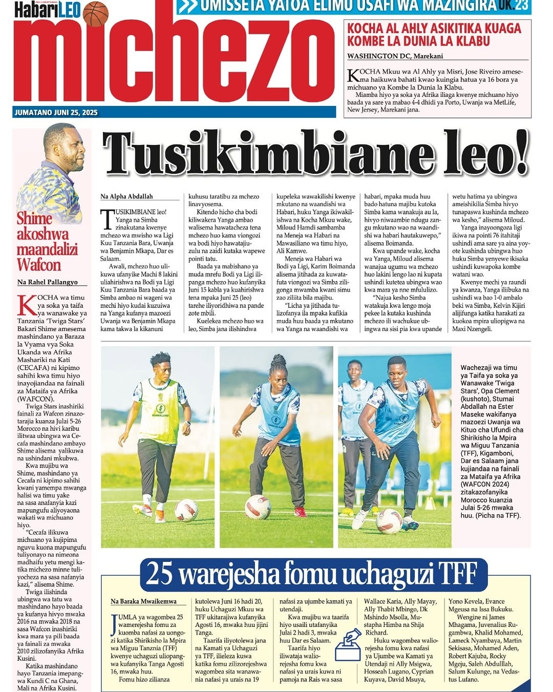 HOME MAGAZETI HABARI KUBWA KWENYE MAGAZETI YA TANZANIA LEO JUMATATO TAREHE 25 JUNI, 2025 admin June 25, 2025 Continue Reading Previous: TPLB YATANGAZA KUKABIDHI TAJI KESHO BAADA YA MECHI YA YANGA NA SIMBANext: RAIS SAMIA MGENI RASMI KILELE CHA MAADHIMISHO YA KITAIFA YA SIKU YA KUPIGA VITA DAWA ZA KULEVYA Leave a Reply Cancel replyYour email address will not be published. Required fields are marked *Comment * Name * Email * Website Save my name, email, and website in this browser for the next time I comment. Δ Related Stories HABARI KUBWA KWENYE MAGAZETI YA TANZANIA LEO JUMATATU TAREHE 01 DISEMBA, 2025 HOME MAGAZETI HABARI KUBWA KWENYE MAGAZETI YA TANZANIA LEO JUMATATU TAREHE 01 DISEMBA, 2025 December 1, 2025 HABARI KUBWA KWENYE MAGAZETI YA TANZANIA LEO JUMANNE TAREHE 25 NOVEMBA, 2025 HOME MAGAZETI HABARI KUBWA KWENYE MAGAZETI YA TANZANIA LEO JUMANNE TAREHE 25 NOVEMBA, 2025 November 25, 2025 WATANO WAFARIKI DUNIA BAADA YA MAGARI MAWILI KUGONGANA 1 min read HOME KITAIFA WATANO WAFARIKI DUNIA BAADA YA MAGARI MAWILI KUGONGANA November 24, 2025