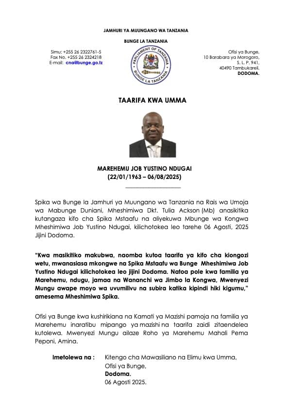 Bunge la Jamhuri ya Muungano wa Tanzania limetangaza kwa masikitiko makubwa kifo cha Spika Mstaafu na aliyewahi kuwa Mbunge wa Kongwa, Mhe. Job Yustino Ndugai, kilichotokea tarehe 6 Agosti 2025 Jijini Dodoma.