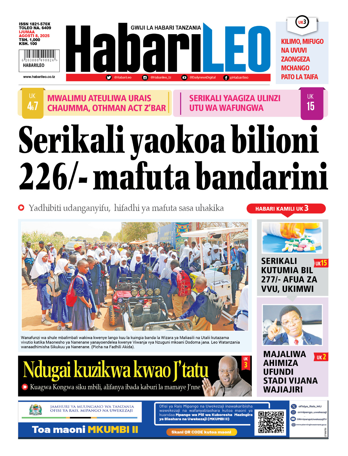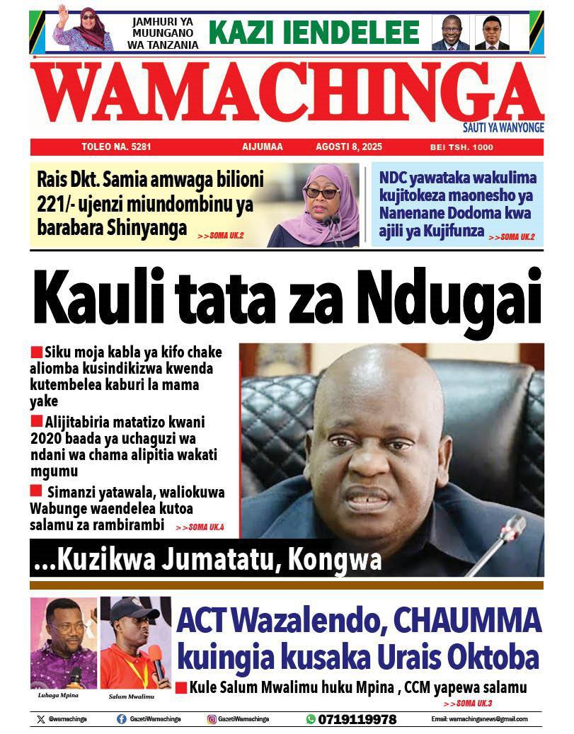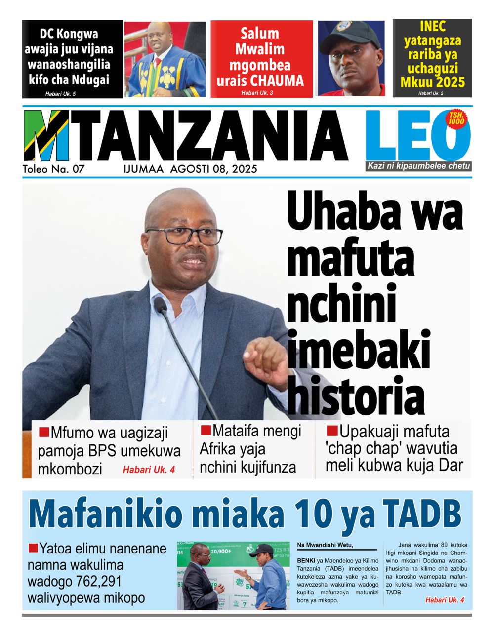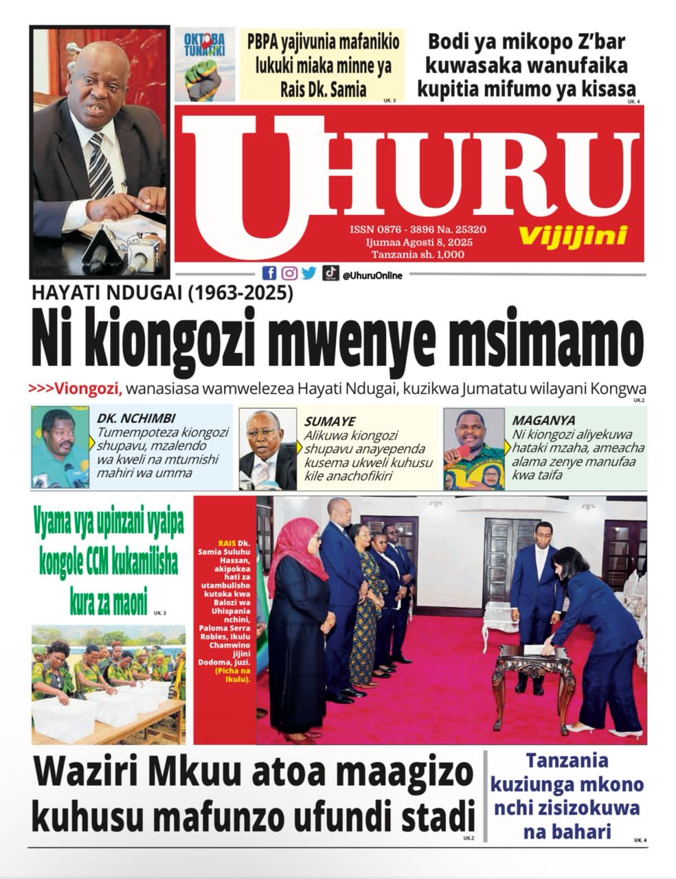 HOME MAGAZETI HABARI KUBWA KWENYE MAGAZETI YA TANZANIA LEO IJUMAA TAREHE 08 AGOSTI, 2025 admin August 8, 2025 Continue Reading Previous: DC MASINDI AHAMASISHA MAENDELEO NA UWAJIBIKAJI, AMFUTA MACHOZI MZEE ALIYEKWAMA GHARAMA ZA MATIBABUNext: WANAOCHEZA NA SIMBA KWENYE ZOO WAPEWA TAHADHARI Leave a Reply Cancel replyYour email address will not be published. Required fields are marked *Comment * Name * Email * Website Save my name, email, and website in this browser for the next time I comment. Δ Related Stories WAZIRI MKUU AKAGUA JENGO LA MAMA NA MTOTO HOSPITALI YA KILUTHERI YA HAYDOM 1 min read HOME KITAIFA WAZIRI MKUU AKAGUA JENGO LA MAMA NA MTOTO HOSPITALI YA KILUTHERI YA HAYDOM March 2, 2026 URITHI WA KARDINALI PENGO: NI WITO WA KUREJEA KWENYE MAADILI, UKWELI NA UMOJA WA KITAIFA 2 min read HOME KITAIFA URITHI WA KARDINALI PENGO: NI WITO WA KUREJEA KWENYE MAADILI, UKWELI NA UMOJA WA KITAIFA March 2, 2026 SERIKALI YA AWAMU YA SITA YASISITIZA UWEZESHWAJI WA WATU WENYE ULEMAVU 2 min read HOME KITAIFA SERIKALI YA AWAMU YA SITA YASISITIZA UWEZESHWAJI WA WATU WENYE ULEMAVU March 2, 2026