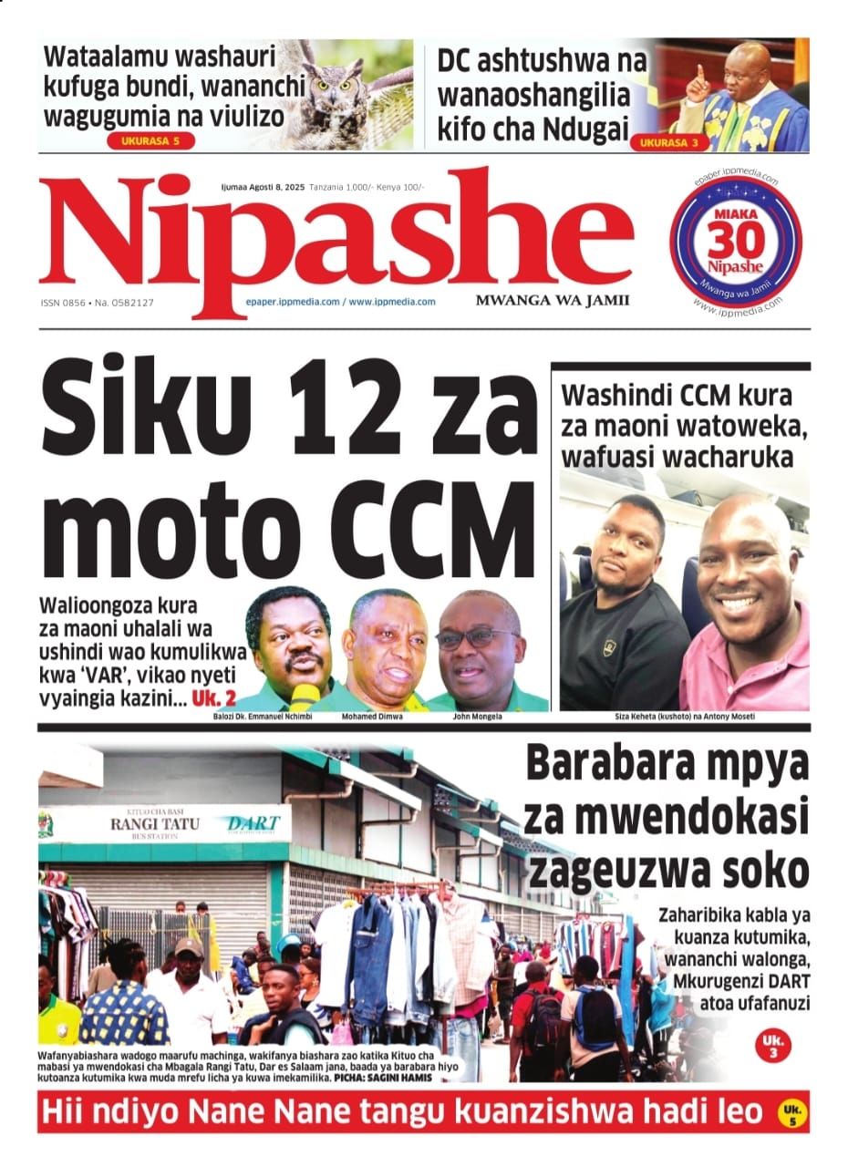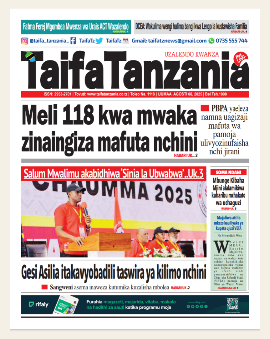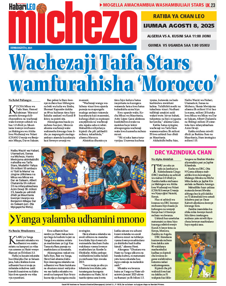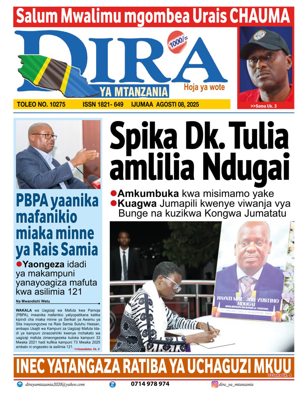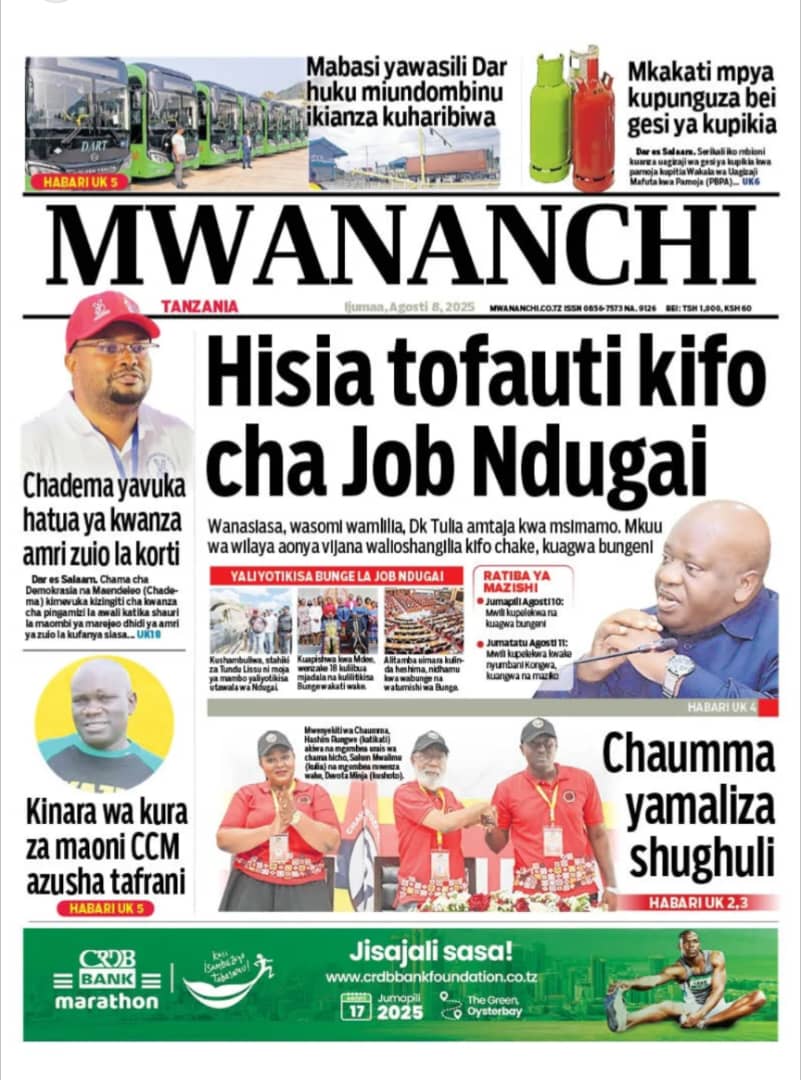 HOME MAGAZETI HABARI KUBWA KWENYE MAGAZETI YA TANZANIA LEO IJUMAA TAREHE 08 AGOSTI, 2025 admin August 8, 2025 Continue Reading Previous: DC MASINDI AHAMASISHA MAENDELEO NA UWAJIBIKAJI, AMFUTA MACHOZI MZEE ALIYEKWAMA GHARAMA ZA MATIBABUNext: WANAOCHEZA NA SIMBA KWENYE ZOO WAPEWA TAHADHARI Leave a Reply Cancel replyYour email address will not be published. Required fields are marked *Comment * Name * Email * Website Save my name, email, and website in this browser for the next time I comment. Δ Related Stories WAZIRI MKUU AKAGUA JENGO LA MAMA NA MTOTO HOSPITALI YA KILUTHERI YA HAYDOM 1 min read HOME KITAIFA WAZIRI MKUU AKAGUA JENGO LA MAMA NA MTOTO HOSPITALI YA KILUTHERI YA HAYDOM March 2, 2026 URITHI WA KARDINALI PENGO: NI WITO WA KUREJEA KWENYE MAADILI, UKWELI NA UMOJA WA KITAIFA 2 min read HOME KITAIFA URITHI WA KARDINALI PENGO: NI WITO WA KUREJEA KWENYE MAADILI, UKWELI NA UMOJA WA KITAIFA March 2, 2026 SERIKALI YA AWAMU YA SITA YASISITIZA UWEZESHWAJI WA WATU WENYE ULEMAVU 2 min read HOME KITAIFA SERIKALI YA AWAMU YA SITA YASISITIZA UWEZESHWAJI WA WATU WENYE ULEMAVU March 2, 2026