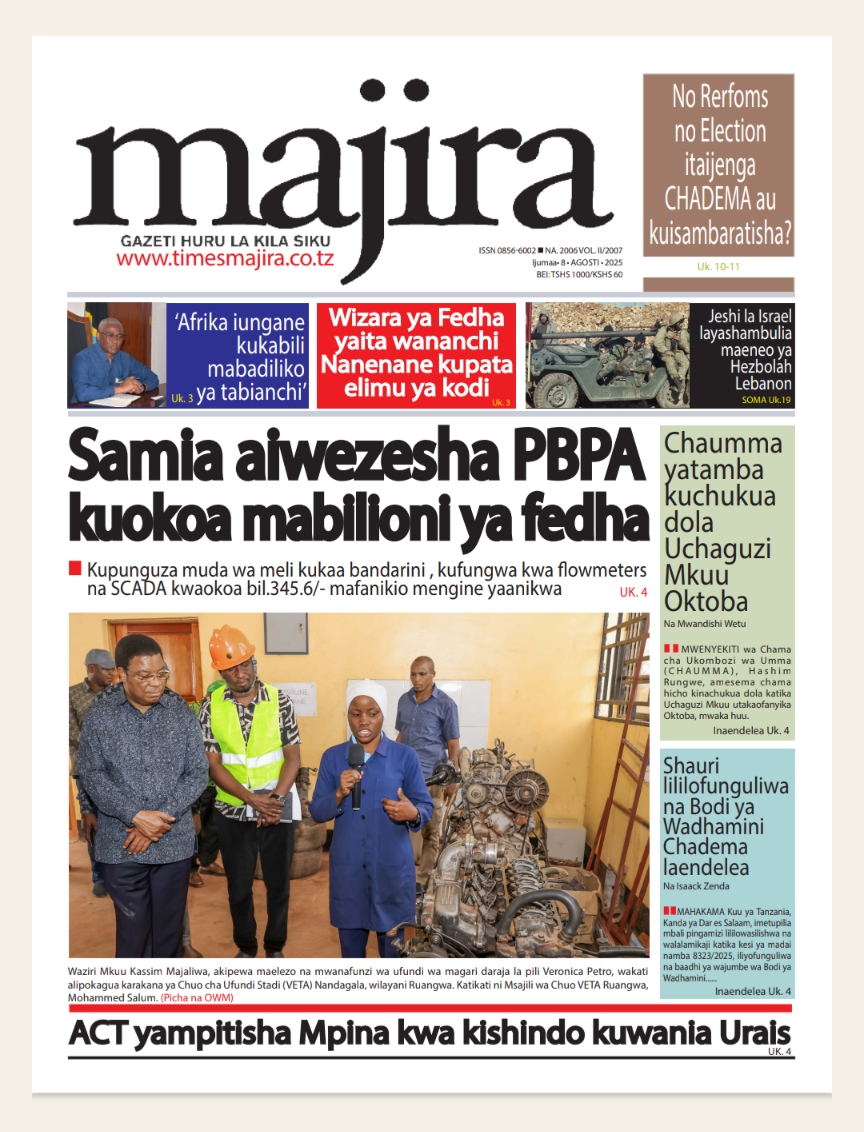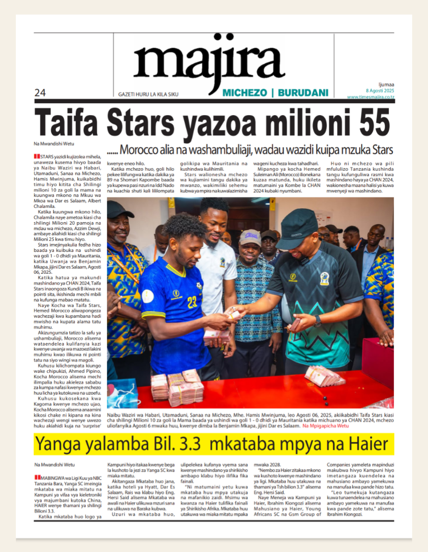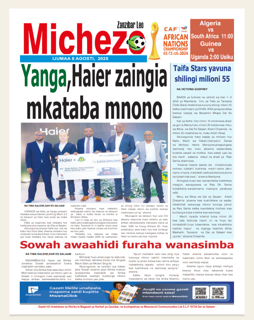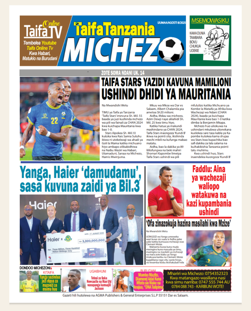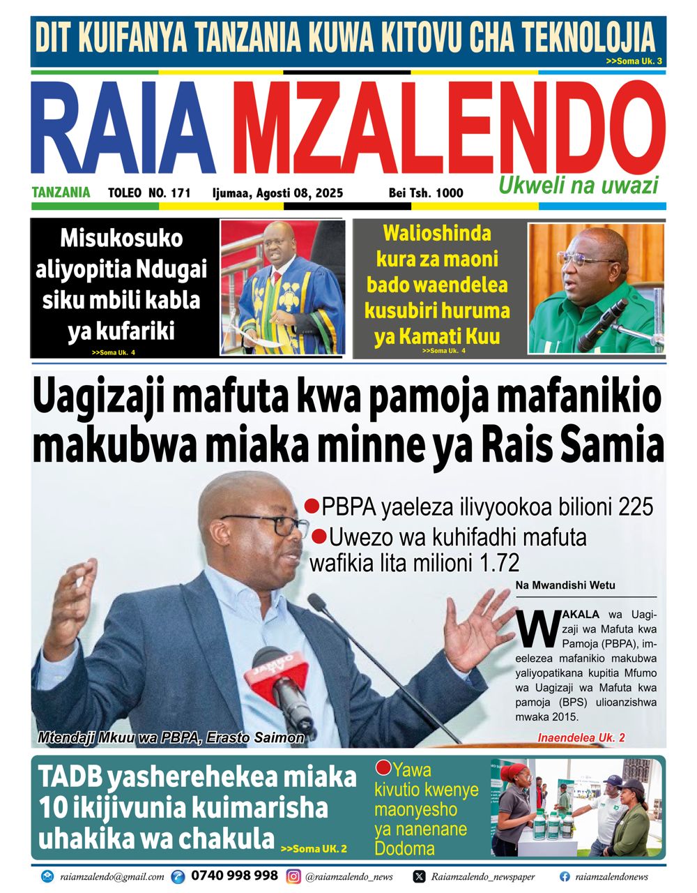 HOME MAGAZETI HABARI KUBWA KWENYE MAGAZETI YA TANZANIA LEO IJUMAA TAREHE 08 AGOSTI, 2025 admin August 8, 2025 Continue Reading Previous: DC MASINDI AHAMASISHA MAENDELEO NA UWAJIBIKAJI, AMFUTA MACHOZI MZEE ALIYEKWAMA GHARAMA ZA MATIBABUNext: WANAOCHEZA NA SIMBA KWENYE ZOO WAPEWA TAHADHARI Leave a Reply Cancel replyYour email address will not be published. Required fields are marked *Comment * Name * Email * Website Save my name, email, and website in this browser for the next time I comment. Δ Related Stories WAZIRI MKUU AKAGUA JENGO LA MAMA NA MTOTO HOSPITALI YA KILUTHERI YA HAYDOM 1 min read HOME KITAIFA WAZIRI MKUU AKAGUA JENGO LA MAMA NA MTOTO HOSPITALI YA KILUTHERI YA HAYDOM March 2, 2026 URITHI WA KARDINALI PENGO: NI WITO WA KUREJEA KWENYE MAADILI, UKWELI NA UMOJA WA KITAIFA 2 min read HOME KITAIFA URITHI WA KARDINALI PENGO: NI WITO WA KUREJEA KWENYE MAADILI, UKWELI NA UMOJA WA KITAIFA March 2, 2026 SERIKALI YA AWAMU YA SITA YASISITIZA UWEZESHWAJI WA WATU WENYE ULEMAVU 2 min read HOME KITAIFA SERIKALI YA AWAMU YA SITA YASISITIZA UWEZESHWAJI WA WATU WENYE ULEMAVU March 2, 2026