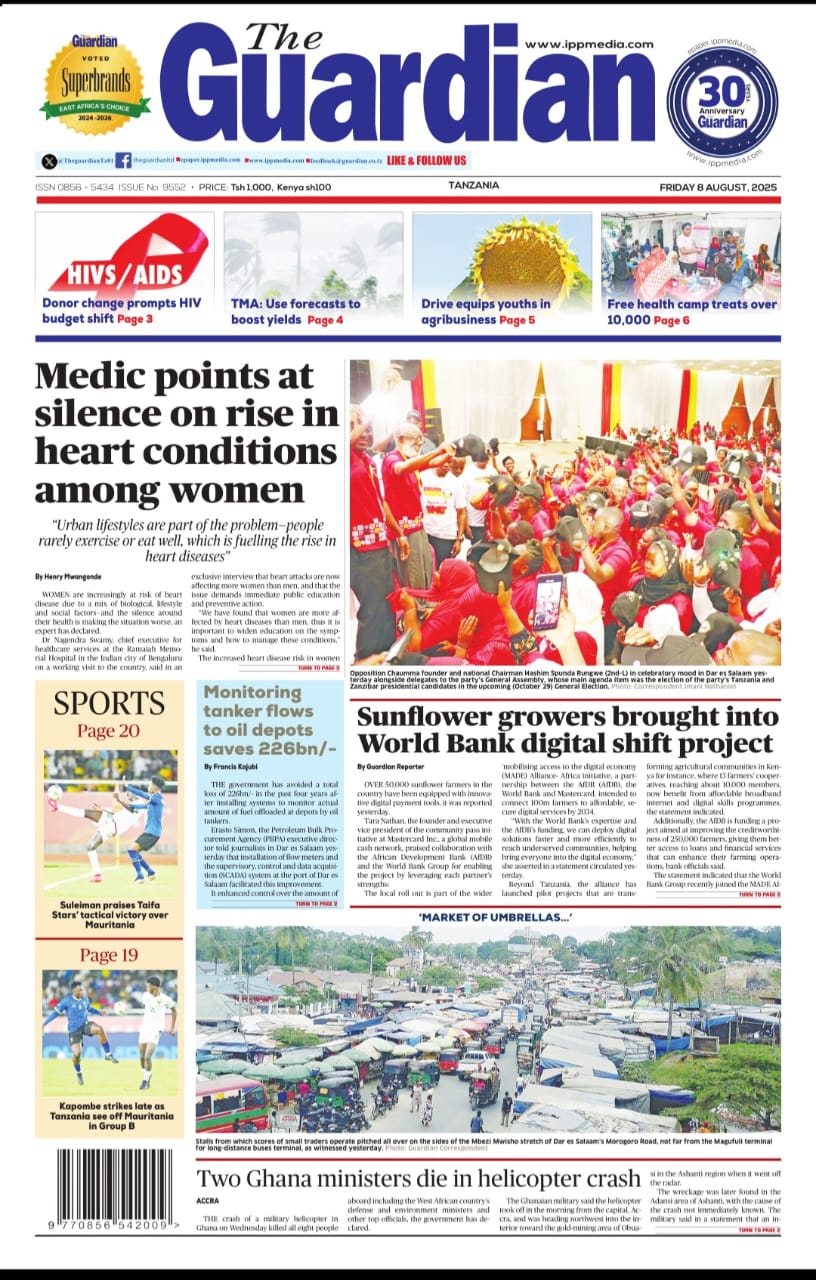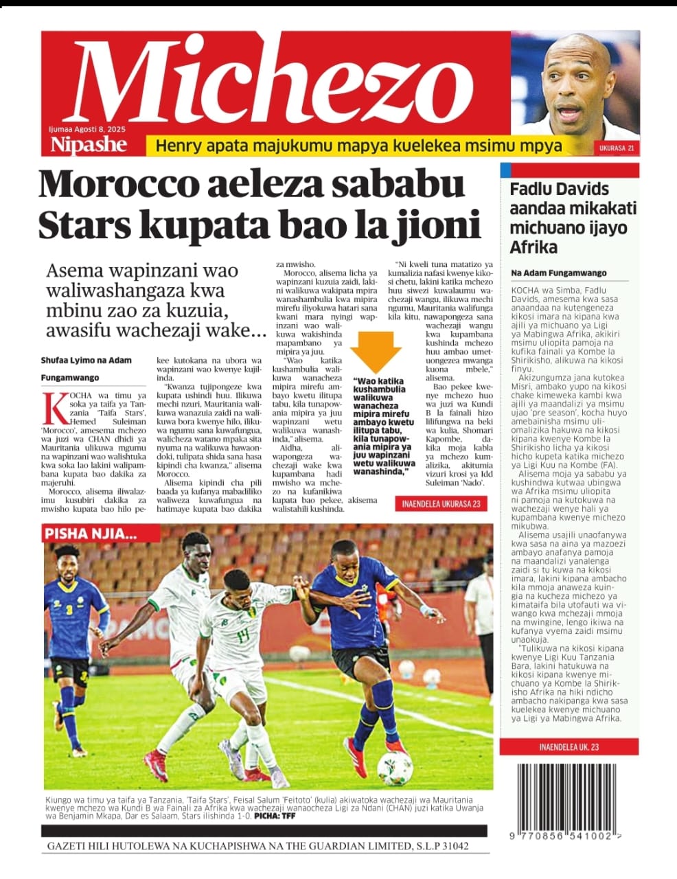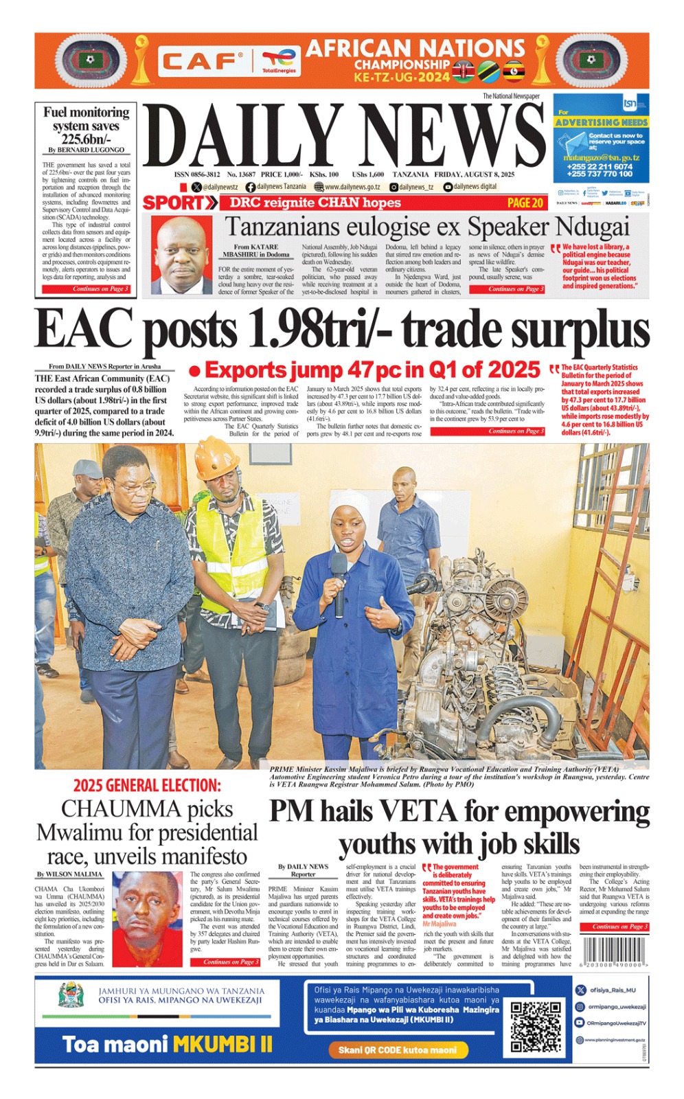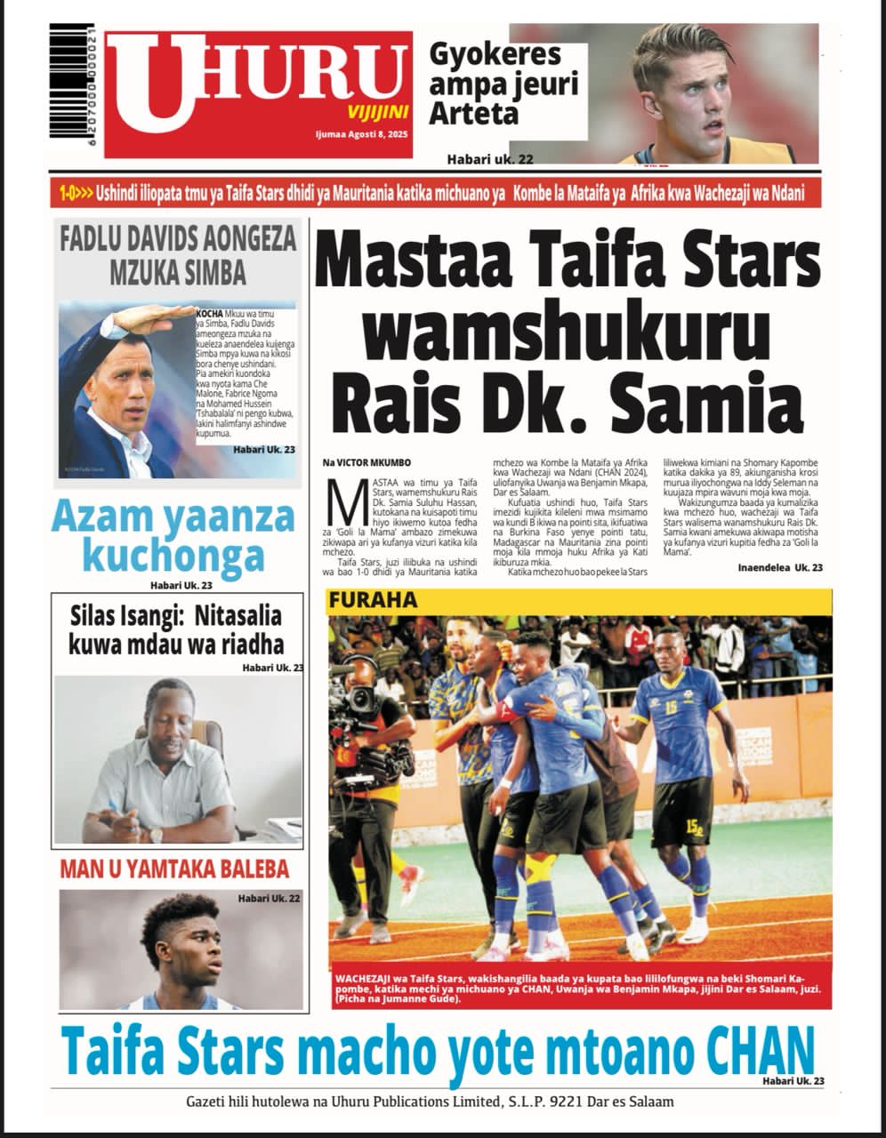 HOME MAGAZETI HABARI KUBWA KWENYE MAGAZETI YA TANZANIA LEO IJUMAA TAREHE 08 AGOSTI, 2025 admin August 8, 2025 Continue Reading Previous: DC MASINDI AHAMASISHA MAENDELEO NA UWAJIBIKAJI, AMFUTA MACHOZI MZEE ALIYEKWAMA GHARAMA ZA MATIBABUNext: WANAOCHEZA NA SIMBA KWENYE ZOO WAPEWA TAHADHARI Leave a Reply Cancel replyYour email address will not be published. Required fields are marked *Comment * Name * Email * Website Save my name, email, and website in this browser for the next time I comment. Δ Related Stories WAZIRI MKUU AKAGUA JENGO LA MAMA NA MTOTO HOSPITALI YA KILUTHERI YA HAYDOM 1 min read HOME KITAIFA WAZIRI MKUU AKAGUA JENGO LA MAMA NA MTOTO HOSPITALI YA KILUTHERI YA HAYDOM March 2, 2026 URITHI WA KARDINALI PENGO: NI WITO WA KUREJEA KWENYE MAADILI, UKWELI NA UMOJA WA KITAIFA 2 min read HOME KITAIFA URITHI WA KARDINALI PENGO: NI WITO WA KUREJEA KWENYE MAADILI, UKWELI NA UMOJA WA KITAIFA March 2, 2026 SERIKALI YA AWAMU YA SITA YASISITIZA UWEZESHWAJI WA WATU WENYE ULEMAVU 2 min read HOME KITAIFA SERIKALI YA AWAMU YA SITA YASISITIZA UWEZESHWAJI WA WATU WENYE ULEMAVU March 2, 2026