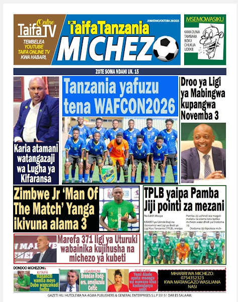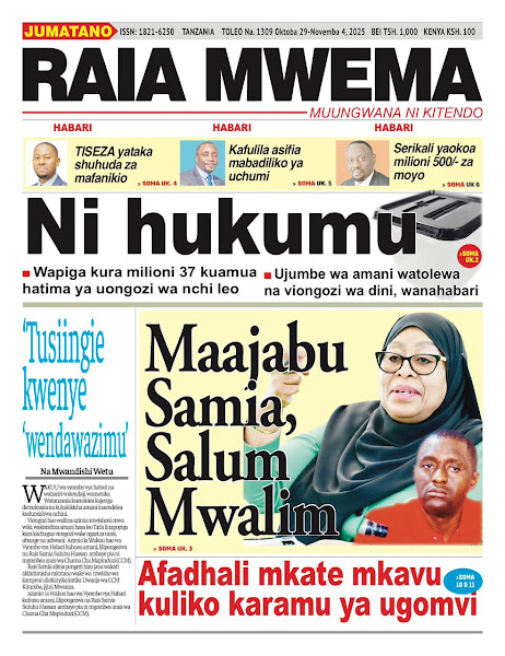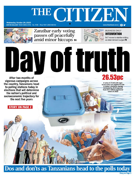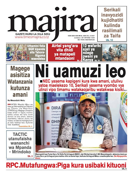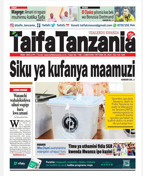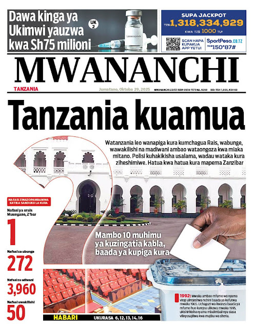 HOME MAGAZETI HABARI KUBWA KWENYE MAGAZETI YA TANZANIA LEO JUMATANO TAREHE 29 OKTOBA, 2025 admin October 29, 2025 Continue Reading Previous: WAPIGA KURA 37,647,235 KUPIGA KURA KATIKA UCHAGUZI MKUU OKTOBA 29, 2025Next: ASKOFU KAEMELA AHIMIZA MATUMIZI SAHIHI YA MITANDAO YA KIJAMII KATIKA KULINDA AMANI YA TANZANIA Leave a Reply Cancel replyYour email address will not be published. Required fields are marked *Comment * Name * Email * Website Save my name, email, and website in this browser for the next time I comment. Δ Related Stories HABARI KUBWA KWENYE MAGAZETI YA TANZANIA LEO JUMANNE TAREHE 06 JANAURI, 2026 HOME MAGAZETI HABARI KUBWA KWENYE MAGAZETI YA TANZANIA LEO JUMANNE TAREHE 06 JANAURI, 2026 January 6, 2026 WAZIRI SANGU ATETA NA VIONGOZI WA MAKANISA YA KIPENTEKOSTE (CPCT) 1 min read HOME KITAIFA WAZIRI SANGU ATETA NA VIONGOZI WA MAKANISA YA KIPENTEKOSTE (CPCT) December 22, 2025 HABARI KUBWA KWENYE MAGAZETI YA TANZANIA LEO JUMATATU TAREHE 22 DISEMBA, 2025 HOME MAGAZETI HABARI KUBWA KWENYE MAGAZETI YA TANZANIA LEO JUMATATU TAREHE 22 DISEMBA, 2025 December 22, 2025