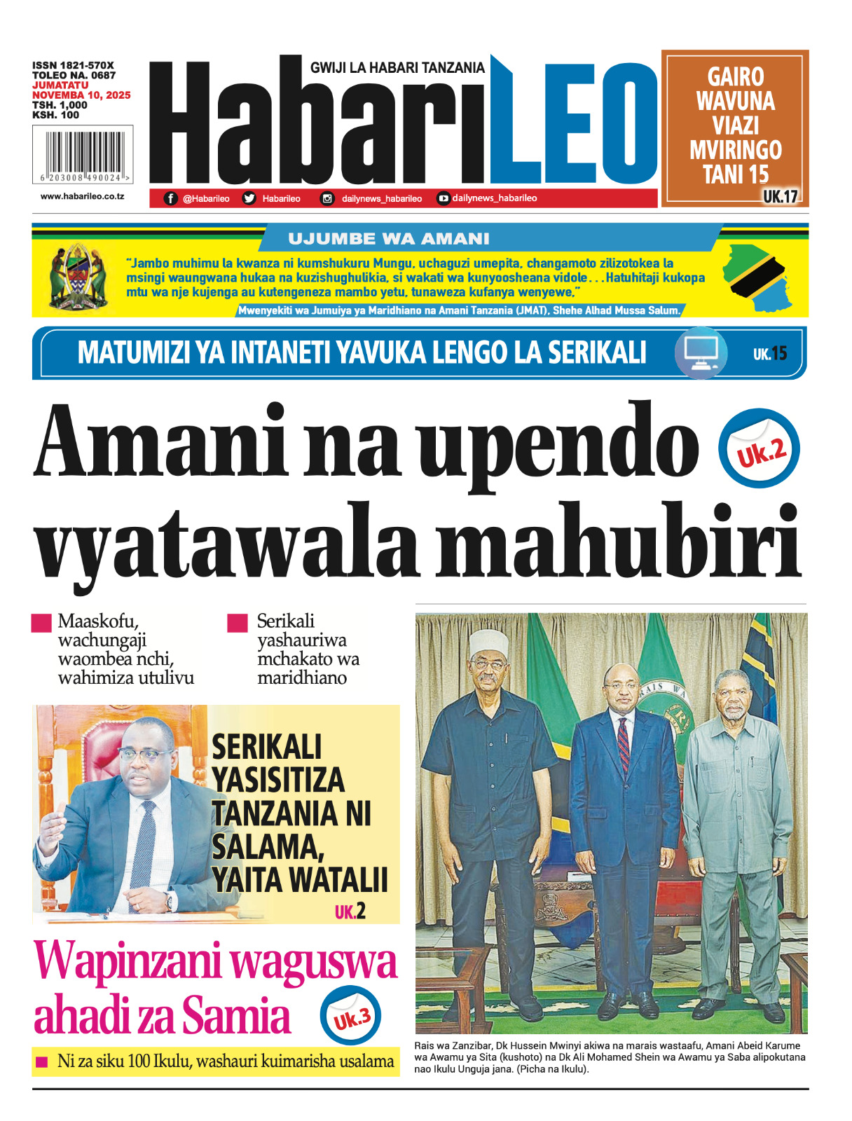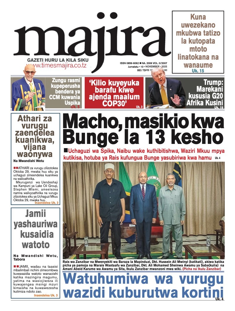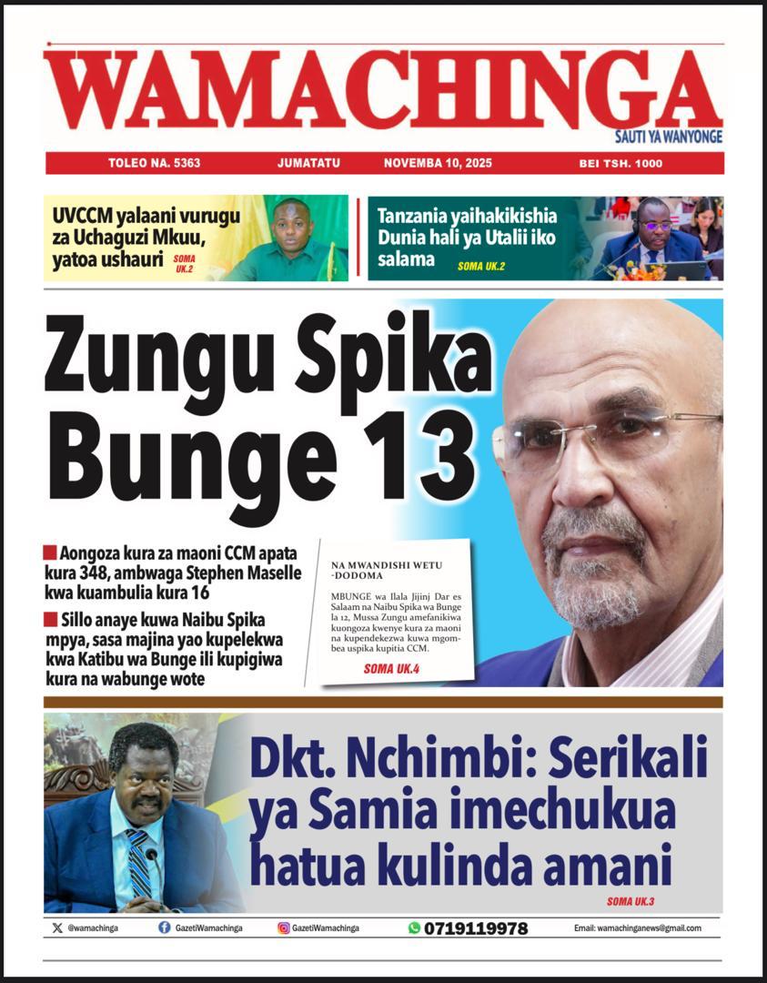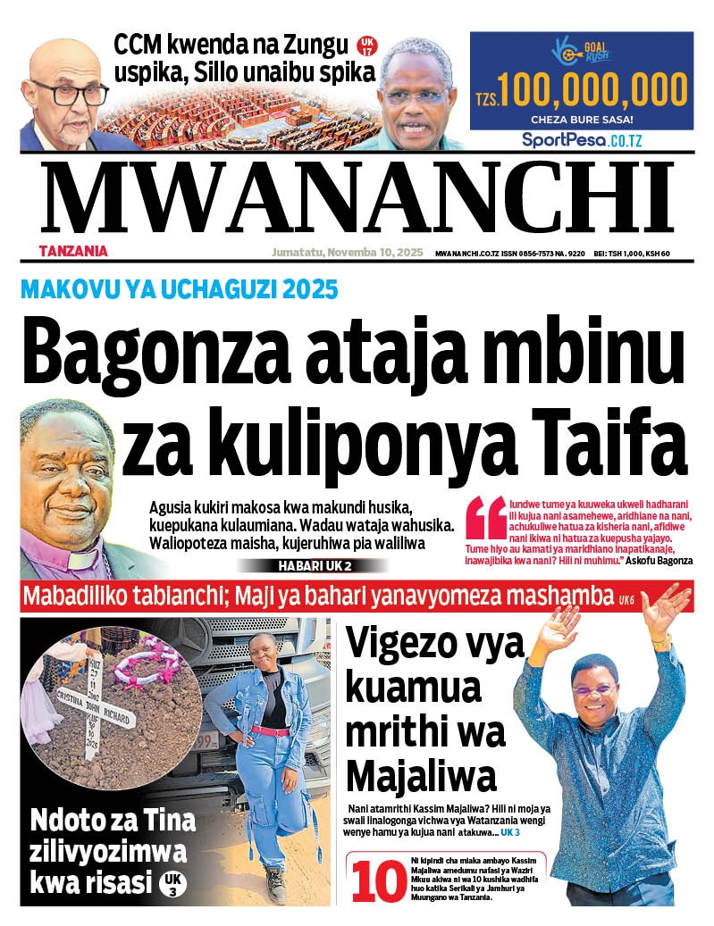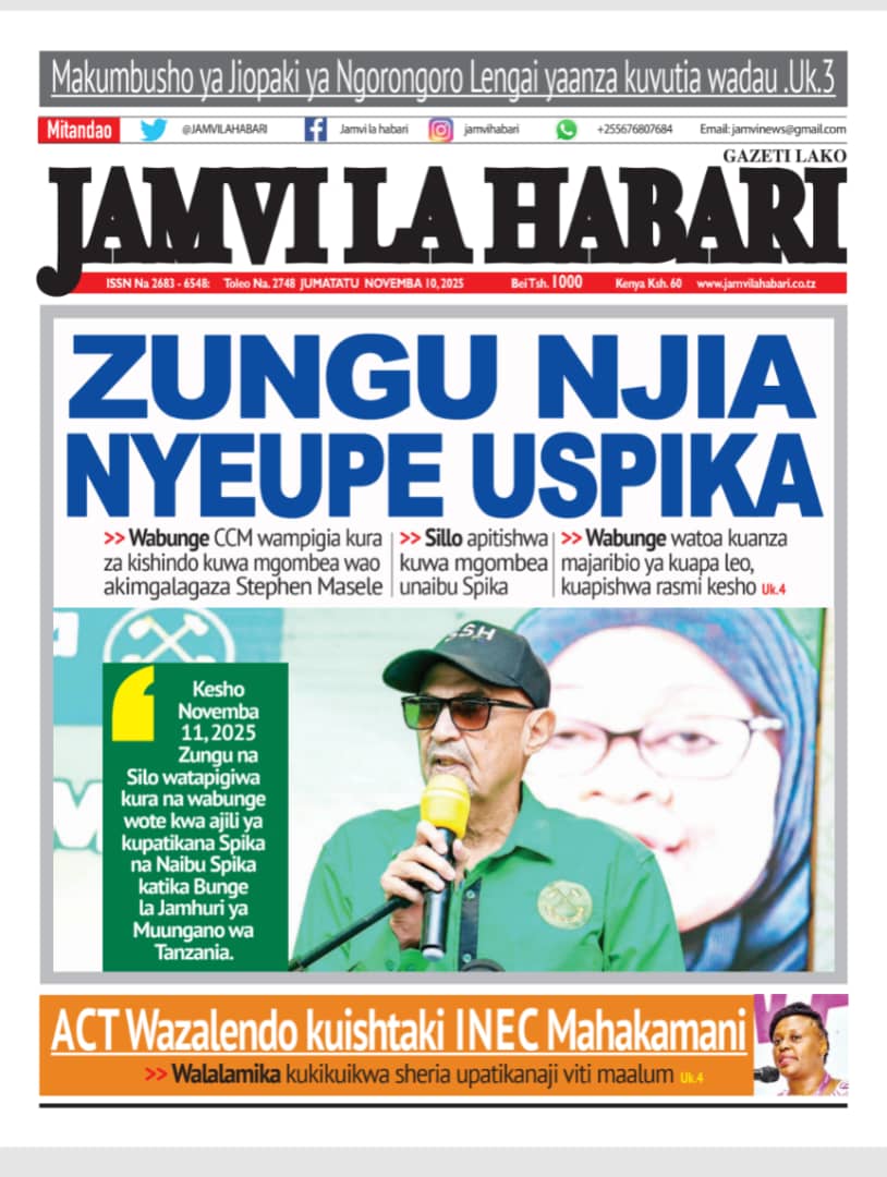 HOME MAGAZETI HABARI KUBWA KWENYE MAGAZETI YA TANZANIA LEO JUMATATU TAREHE 10 NOVEMBA, 2025 admin November 10, 2025 Continue Reading Previous: SPIKA WA KWANZA MWANAMKE MAREKANI ATANGAZA KUSTAAFU, AACHA HISTORIANext: ZUNGU ACHAGULIWA KWA KISHINDO KUWANIA USPIKA WA BUNGE KUPITIA CCM, SILLO NAIBU SPIKA Leave a Reply Cancel replyYour email address will not be published. Required fields are marked *Comment * Name * Email * Website Save my name, email, and website in this browser for the next time I comment. Δ Related Stories HABARI KUBWA KWENYE MAGAZETI YA TANZANIA LEO JUMANNE TAREHE 06 JANAURI, 2026 HOME MAGAZETI HABARI KUBWA KWENYE MAGAZETI YA TANZANIA LEO JUMANNE TAREHE 06 JANAURI, 2026 January 6, 2026 WAZIRI SANGU ATETA NA VIONGOZI WA MAKANISA YA KIPENTEKOSTE (CPCT) 1 min read HOME KITAIFA WAZIRI SANGU ATETA NA VIONGOZI WA MAKANISA YA KIPENTEKOSTE (CPCT) December 22, 2025 HABARI KUBWA KWENYE MAGAZETI YA TANZANIA LEO JUMATATU TAREHE 22 DISEMBA, 2025 HOME MAGAZETI HABARI KUBWA KWENYE MAGAZETI YA TANZANIA LEO JUMATATU TAREHE 22 DISEMBA, 2025 December 22, 2025