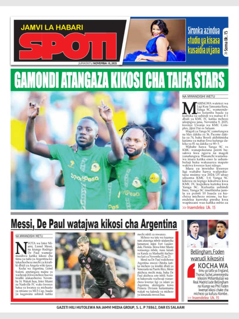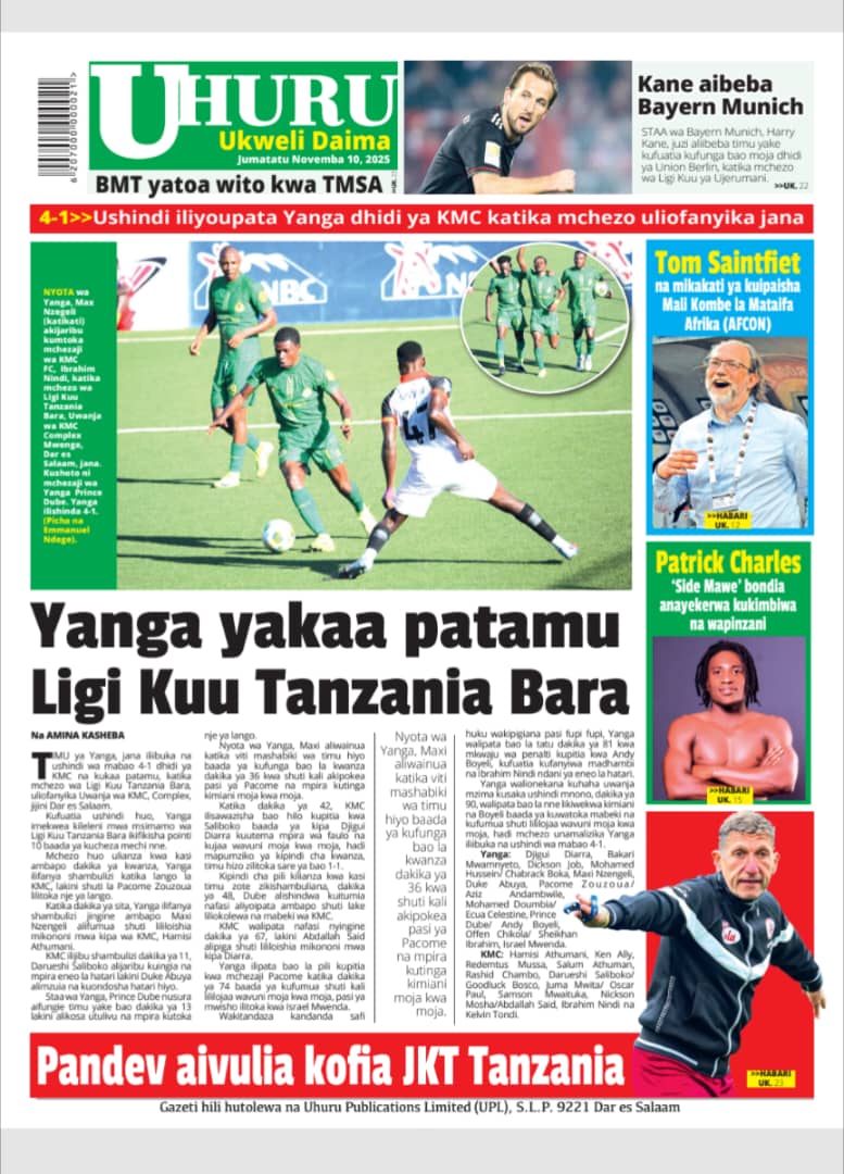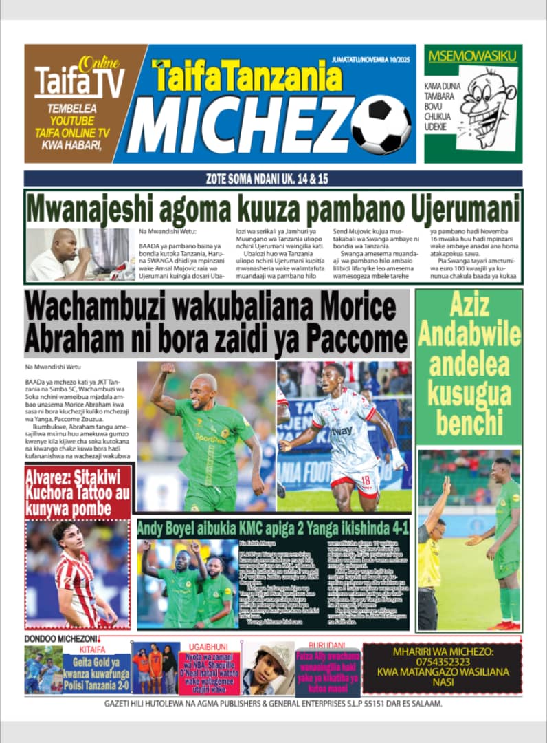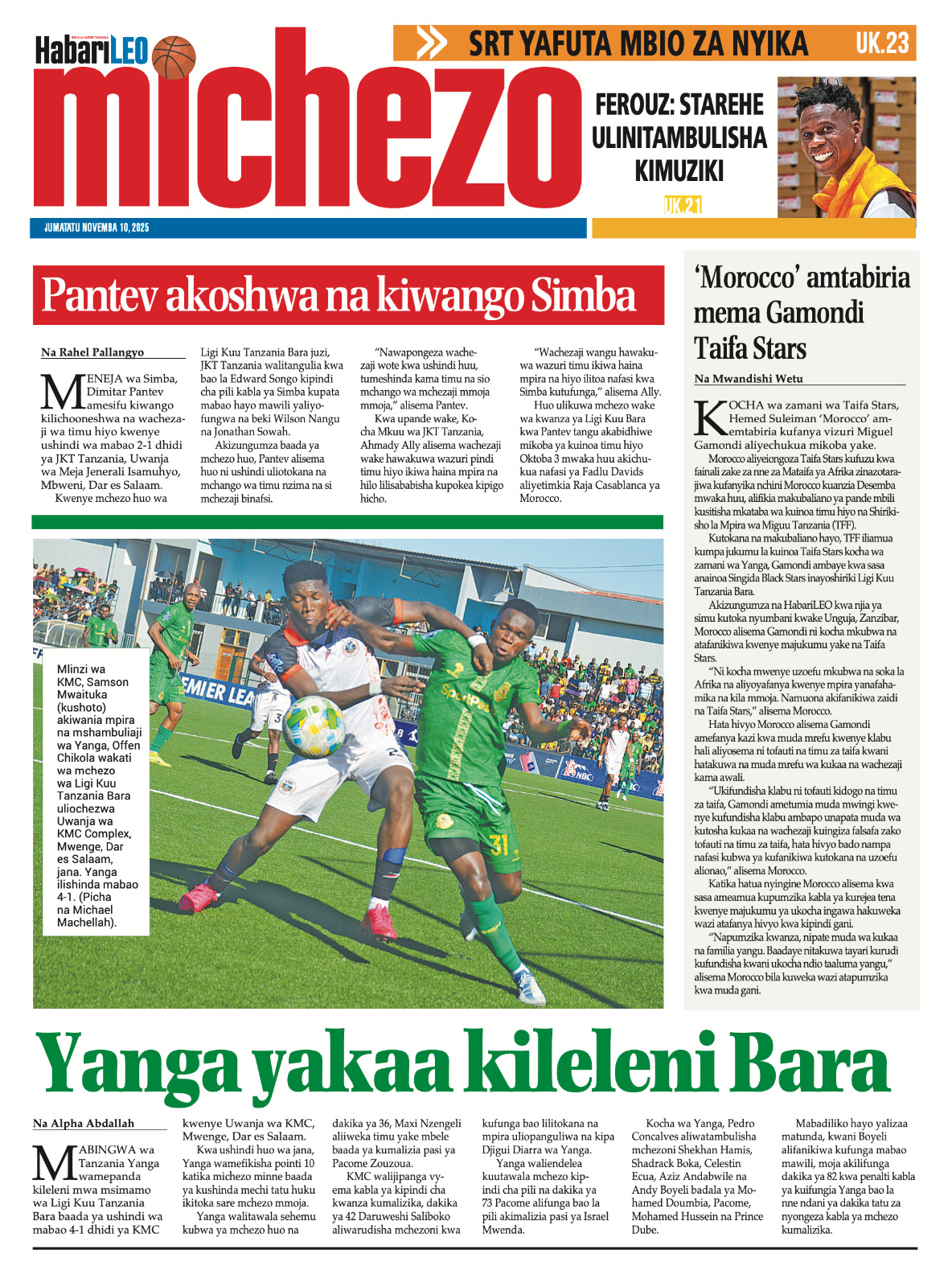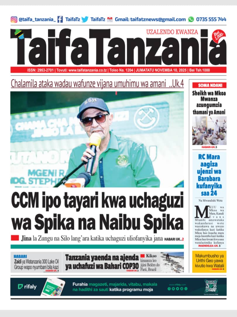 HOME MAGAZETI HABARI KUBWA KWENYE MAGAZETI YA TANZANIA LEO JUMATATU TAREHE 10 NOVEMBA, 2025 admin November 10, 2025 Continue Reading Previous: SPIKA WA KWANZA MWANAMKE MAREKANI ATANGAZA KUSTAAFU, AACHA HISTORIANext: ZUNGU ACHAGULIWA KWA KISHINDO KUWANIA USPIKA WA BUNGE KUPITIA CCM, SILLO NAIBU SPIKA Leave a Reply Cancel replyYour email address will not be published. Required fields are marked *Comment * Name * Email * Website Save my name, email, and website in this browser for the next time I comment. Δ Related Stories HABARI KUBWA KWENYE MAGAZETI YA TANZANIA LEO JUMANNE TAREHE 06 JANAURI, 2026 HOME MAGAZETI HABARI KUBWA KWENYE MAGAZETI YA TANZANIA LEO JUMANNE TAREHE 06 JANAURI, 2026 January 6, 2026 WAZIRI SANGU ATETA NA VIONGOZI WA MAKANISA YA KIPENTEKOSTE (CPCT) 1 min read HOME KITAIFA WAZIRI SANGU ATETA NA VIONGOZI WA MAKANISA YA KIPENTEKOSTE (CPCT) December 22, 2025 HABARI KUBWA KWENYE MAGAZETI YA TANZANIA LEO JUMATATU TAREHE 22 DISEMBA, 2025 HOME MAGAZETI HABARI KUBWA KWENYE MAGAZETI YA TANZANIA LEO JUMATATU TAREHE 22 DISEMBA, 2025 December 22, 2025