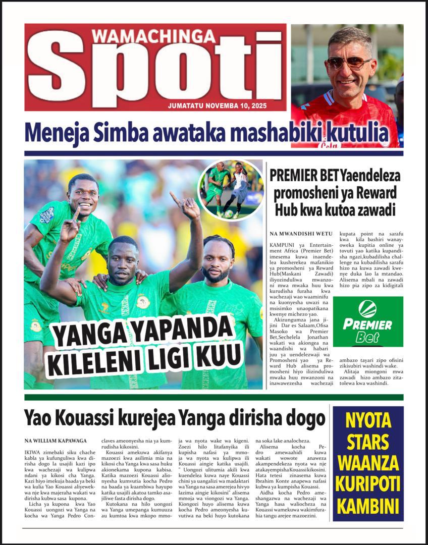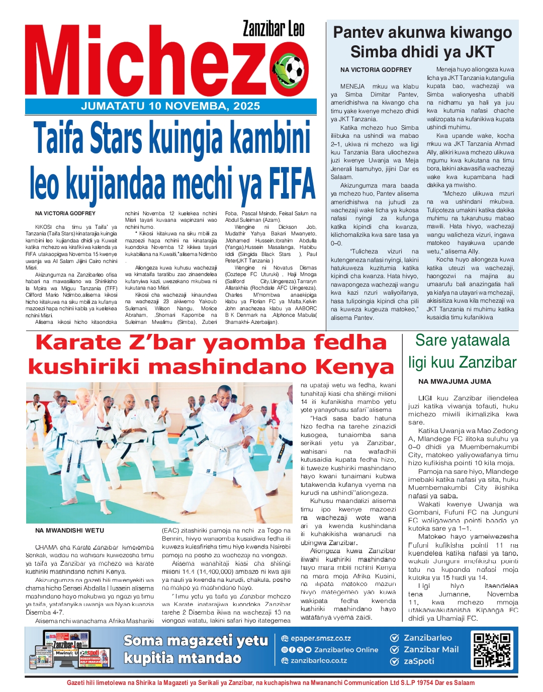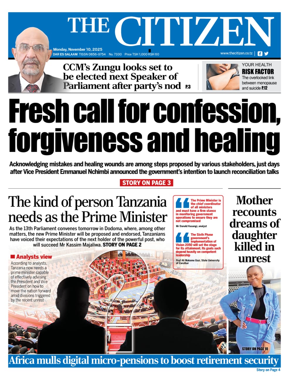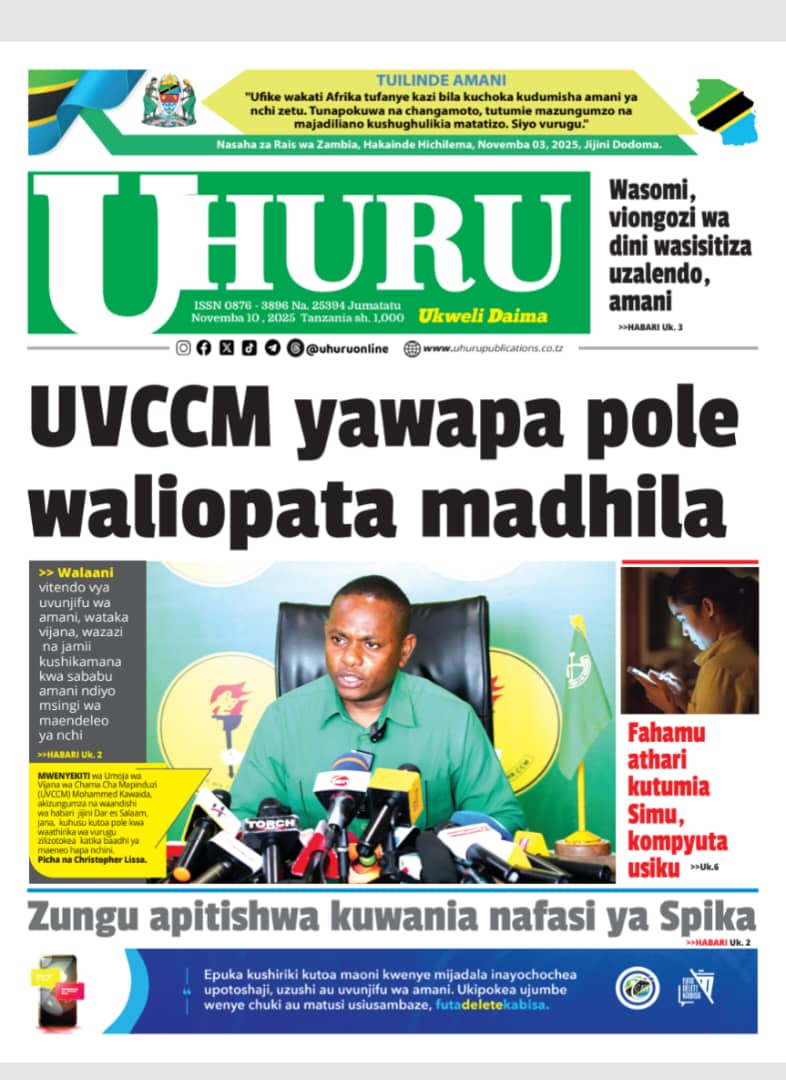 HOME MAGAZETI HABARI KUBWA KWENYE MAGAZETI YA TANZANIA LEO JUMATATU TAREHE 10 NOVEMBA, 2025 admin November 10, 2025 Continue Reading Previous: SPIKA WA KWANZA MWANAMKE MAREKANI ATANGAZA KUSTAAFU, AACHA HISTORIANext: ZUNGU ACHAGULIWA KWA KISHINDO KUWANIA USPIKA WA BUNGE KUPITIA CCM, SILLO NAIBU SPIKA Leave a Reply Cancel replyYour email address will not be published. Required fields are marked *Comment * Name * Email * Website Save my name, email, and website in this browser for the next time I comment. Δ Related Stories HABARI KUBWA KWENYE MAGAZETI YA TANZANIA LEO JUMANNE TAREHE 06 JANAURI, 2026 HOME MAGAZETI HABARI KUBWA KWENYE MAGAZETI YA TANZANIA LEO JUMANNE TAREHE 06 JANAURI, 2026 January 6, 2026 WAZIRI SANGU ATETA NA VIONGOZI WA MAKANISA YA KIPENTEKOSTE (CPCT) 1 min read HOME KITAIFA WAZIRI SANGU ATETA NA VIONGOZI WA MAKANISA YA KIPENTEKOSTE (CPCT) December 22, 2025 HABARI KUBWA KWENYE MAGAZETI YA TANZANIA LEO JUMATATU TAREHE 22 DISEMBA, 2025 HOME MAGAZETI HABARI KUBWA KWENYE MAGAZETI YA TANZANIA LEO JUMATATU TAREHE 22 DISEMBA, 2025 December 22, 2025