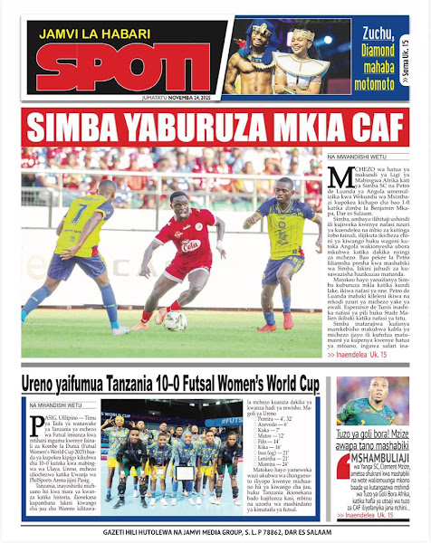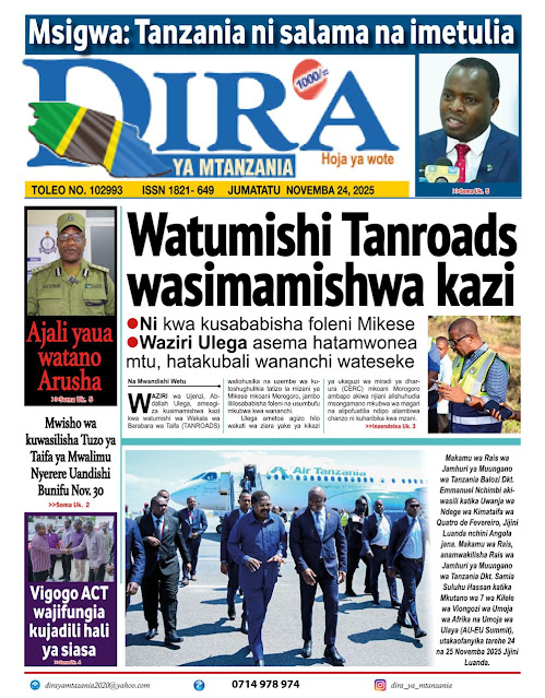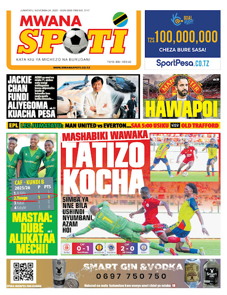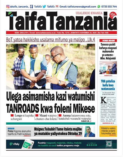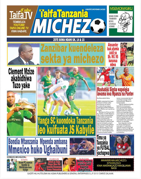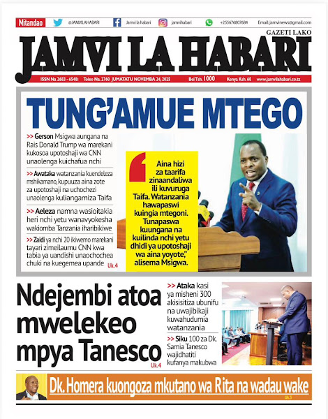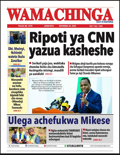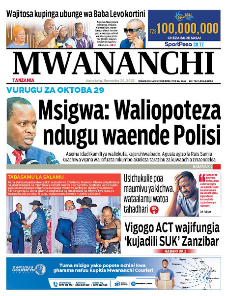 HOME MAGAZETI HABARI KUBWA KWENYE MAGAZETI YA TANZANIA LEO JUMATATU TAREHE 24 NOVEMBA, 2025 admin November 24, 2025 Continue Reading Previous: RAIS SAMIA NA RAIS MUSEVENI WATUNUKIWA TUZO ZA HESHIMA NA CAFNext: SERIKALI YAWAHAKIKISHIA WANANCHI USALAMA IFIKAPO DISEMBA 9 Leave a Reply Cancel replyYour email address will not be published. Required fields are marked *Comment * Name * Email * Website Save my name, email, and website in this browser for the next time I comment. Δ Related Stories HABARI KUBWA KWENYE MAGAZETI YA TANZANIA LEO JUMATATU TAREHE 01 DISEMBA, 2025 HOME MAGAZETI HABARI KUBWA KWENYE MAGAZETI YA TANZANIA LEO JUMATATU TAREHE 01 DISEMBA, 2025 December 1, 2025 HABARI KUBWA KWENYE MAGAZETI YA TANZANIA LEO JUMANNE TAREHE 25 NOVEMBA, 2025 HOME MAGAZETI HABARI KUBWA KWENYE MAGAZETI YA TANZANIA LEO JUMANNE TAREHE 25 NOVEMBA, 2025 November 25, 2025 WATANO WAFARIKI DUNIA BAADA YA MAGARI MAWILI KUGONGANA 1 min read HOME KITAIFA WATANO WAFARIKI DUNIA BAADA YA MAGARI MAWILI KUGONGANA November 24, 2025
