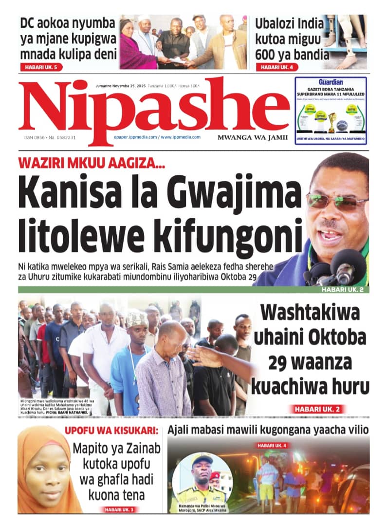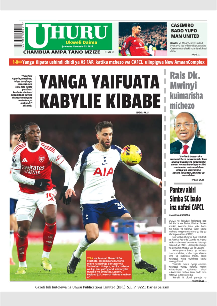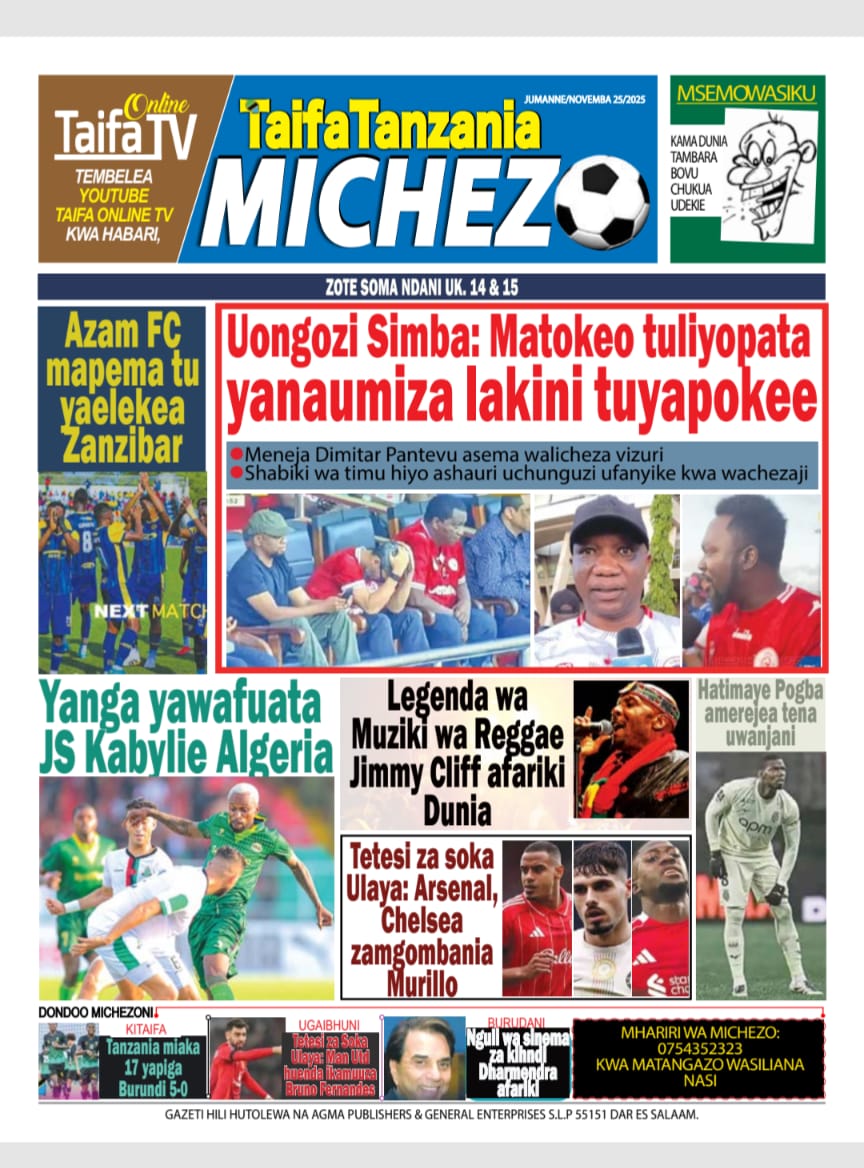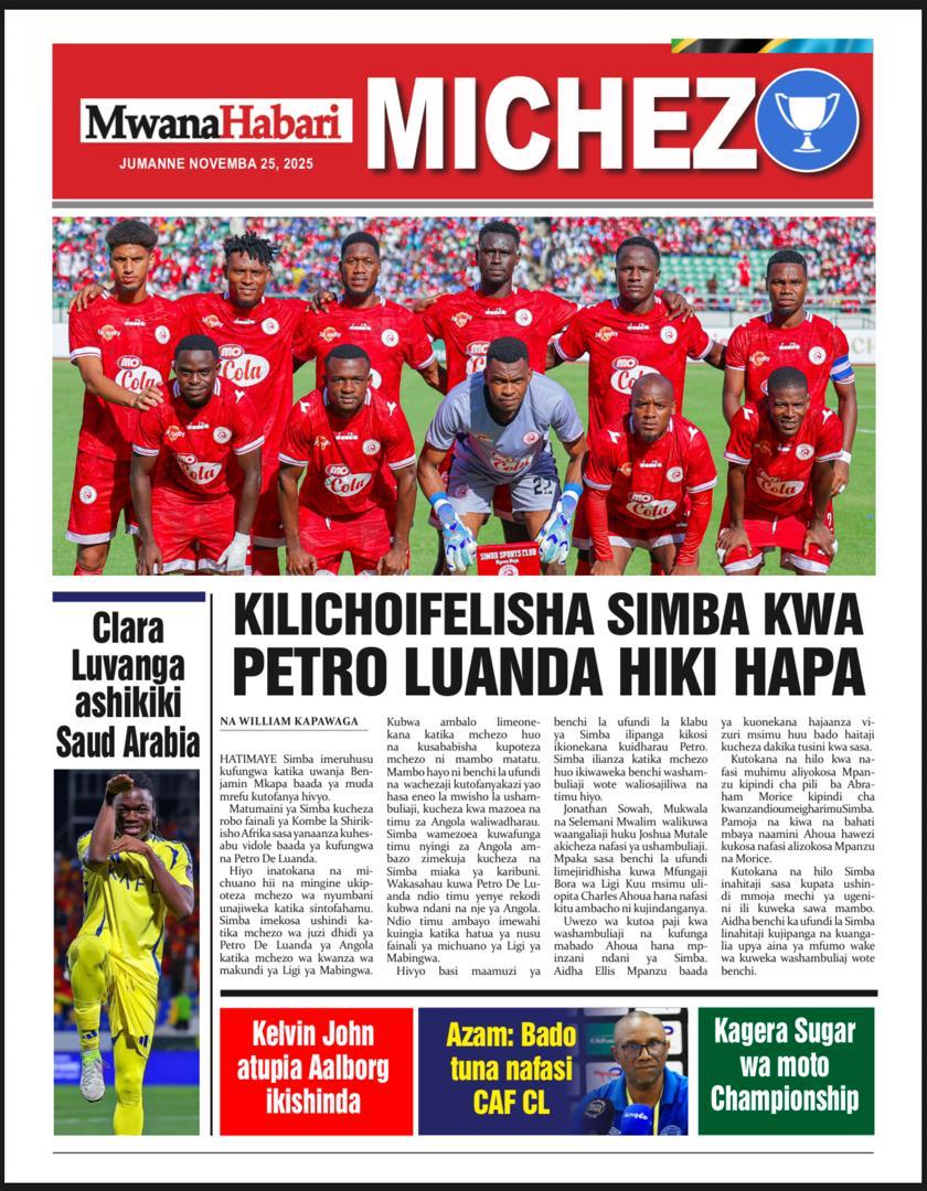 HOME MAGAZETI HABARI KUBWA KWENYE MAGAZETI YA TANZANIA LEO JUMANNE TAREHE 25 NOVEMBA, 2025 admin November 25, 2025 Continue Reading Previous: WATANO WAFARIKI DUNIA BAADA YA MAGARI MAWILI KUGONGANANext: HABARI KUBWA KWENYE MAGAZETI YA TANZANIA LEO JUMATATU TAREHE 01 DISEMBA, 2025 Leave a Reply Cancel replyYour email address will not be published. Required fields are marked *Comment * Name * Email * Website Save my name, email, and website in this browser for the next time I comment. Δ Related Stories HABARI KUBWA KWENYE MAGAZETI YA TANZANIA LEO JUMATATU TAREHE 01 DISEMBA, 2025 HOME MAGAZETI HABARI KUBWA KWENYE MAGAZETI YA TANZANIA LEO JUMATATU TAREHE 01 DISEMBA, 2025 December 1, 2025 WATANO WAFARIKI DUNIA BAADA YA MAGARI MAWILI KUGONGANA 1 min read HOME KITAIFA WATANO WAFARIKI DUNIA BAADA YA MAGARI MAWILI KUGONGANA November 24, 2025 SIMBA SC YAKUBALI KIPIGO NYUMBANI DHIDI YA PETRO ATLETICO DE LUANDA 1 min read HOME MICHEZO NA BURUDANI SIMBA SC YAKUBALI KIPIGO NYUMBANI DHIDI YA PETRO ATLETICO DE LUANDA November 24, 2025