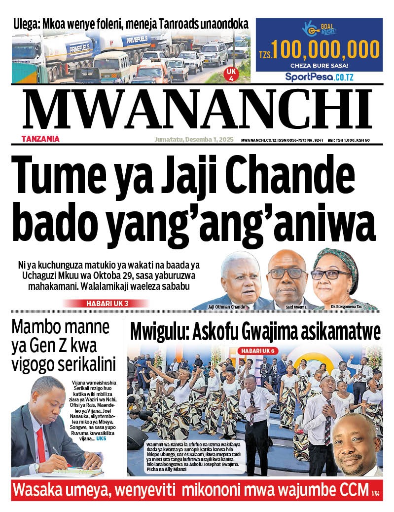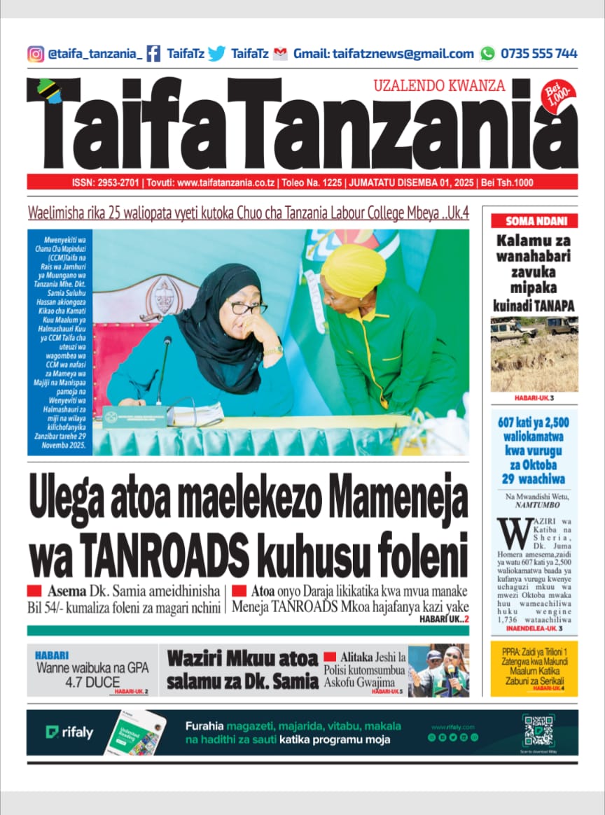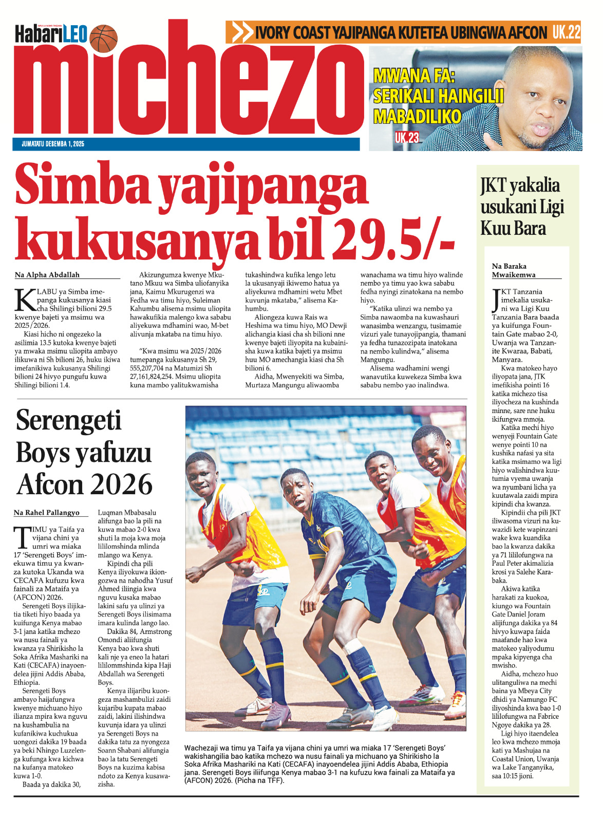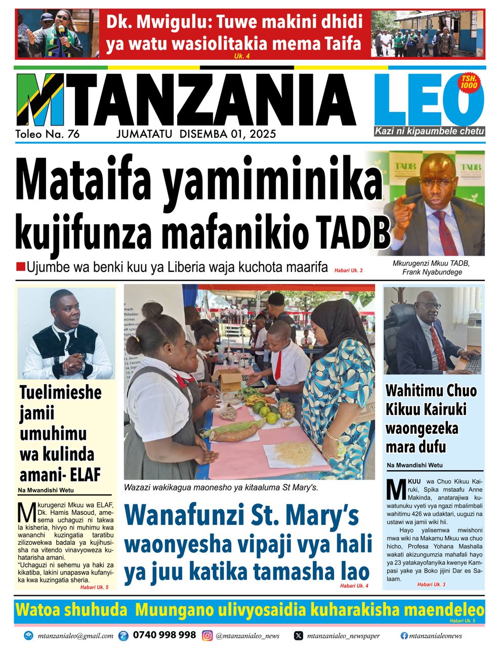 HOME MAGAZETI HABARI KUBWA KWENYE MAGAZETI YA TANZANIA LEO JUMATATU TAREHE 01 DISEMBA, 2025 admin December 1, 2025 Continue Reading Previous: HABARI KUBWA KWENYE MAGAZETI YA TANZANIA LEO JUMANNE TAREHE 25 NOVEMBA, 2025 Leave a Reply Cancel replyYour email address will not be published. Required fields are marked *Comment * Name * Email * Website Save my name, email, and website in this browser for the next time I comment. Δ Related Stories HABARI KUBWA KWENYE MAGAZETI YA TANZANIA LEO JUMANNE TAREHE 25 NOVEMBA, 2025 HOME MAGAZETI HABARI KUBWA KWENYE MAGAZETI YA TANZANIA LEO JUMANNE TAREHE 25 NOVEMBA, 2025 November 25, 2025 WATANO WAFARIKI DUNIA BAADA YA MAGARI MAWILI KUGONGANA 1 min read HOME KITAIFA WATANO WAFARIKI DUNIA BAADA YA MAGARI MAWILI KUGONGANA November 24, 2025 SIMBA SC YAKUBALI KIPIGO NYUMBANI DHIDI YA PETRO ATLETICO DE LUANDA 1 min read HOME MICHEZO NA BURUDANI SIMBA SC YAKUBALI KIPIGO NYUMBANI DHIDI YA PETRO ATLETICO DE LUANDA November 24, 2025
