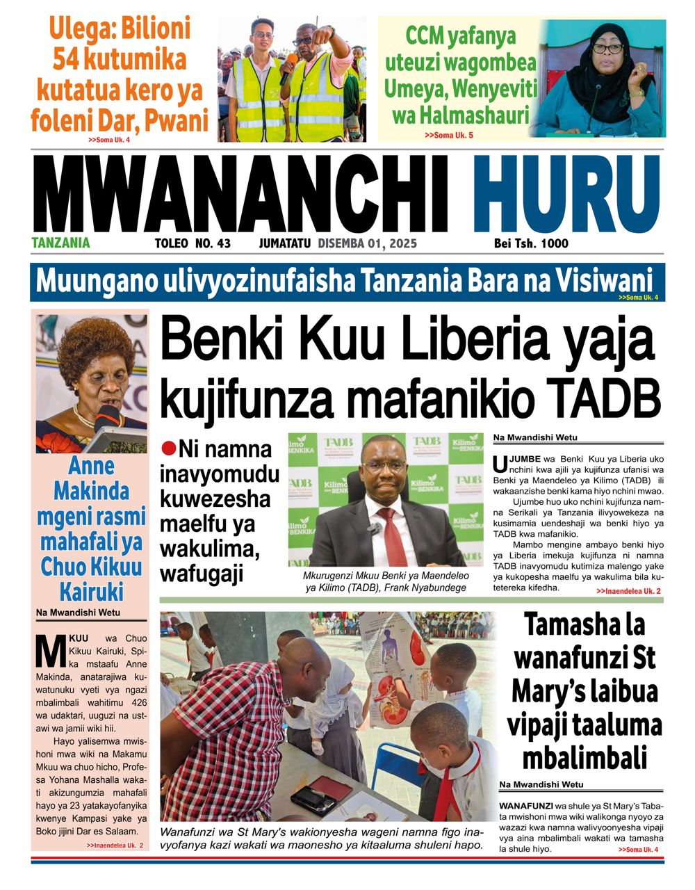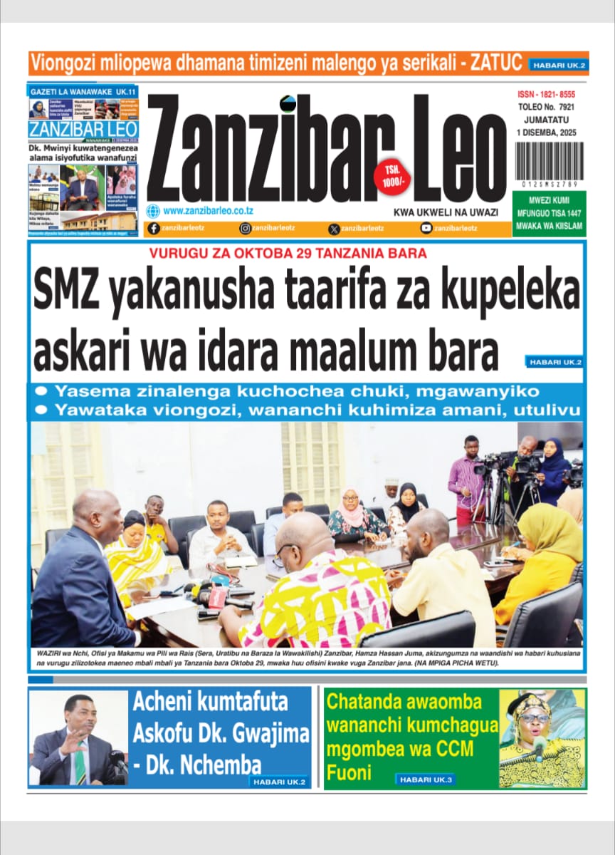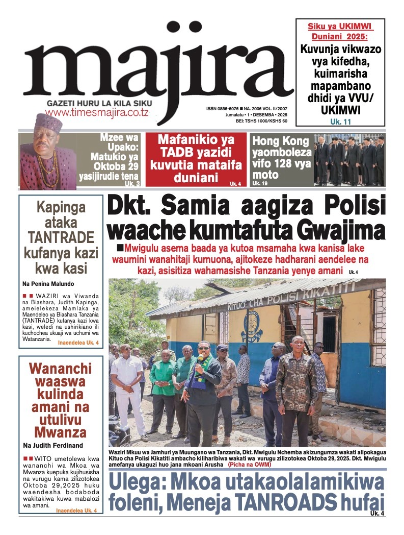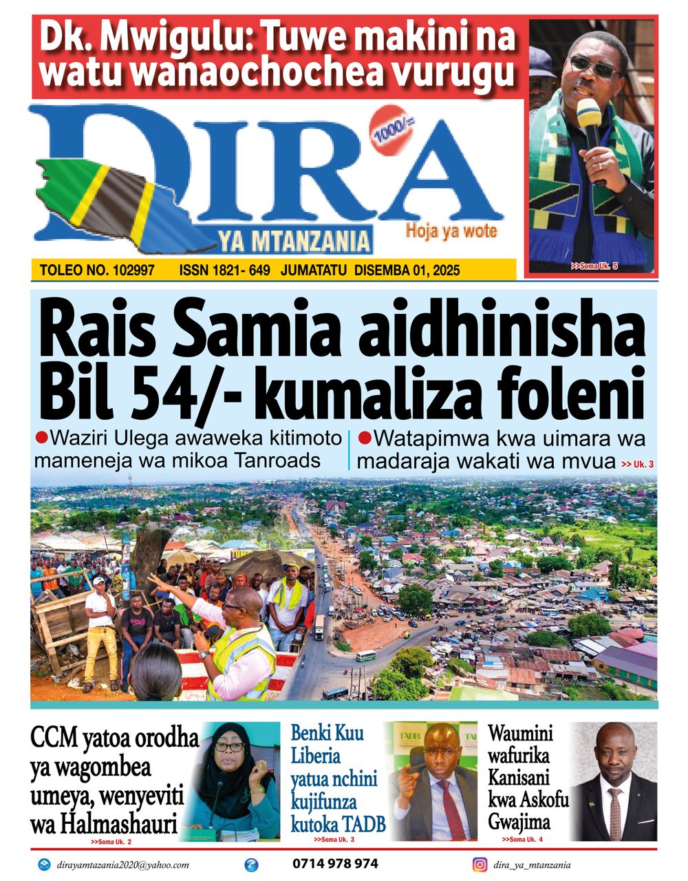 HOME MAGAZETI HABARI KUBWA KWENYE MAGAZETI YA TANZANIA LEO JUMATATU TAREHE 01 DISEMBA, 2025 admin December 1, 2025 Continue Reading Previous: HABARI KUBWA KWENYE MAGAZETI YA TANZANIA LEO JUMANNE TAREHE 25 NOVEMBA, 2025 Leave a Reply Cancel replyYour email address will not be published. Required fields are marked *Comment * Name * Email * Website Save my name, email, and website in this browser for the next time I comment. Δ Related Stories HABARI KUBWA KWENYE MAGAZETI YA TANZANIA LEO JUMANNE TAREHE 25 NOVEMBA, 2025 HOME MAGAZETI HABARI KUBWA KWENYE MAGAZETI YA TANZANIA LEO JUMANNE TAREHE 25 NOVEMBA, 2025 November 25, 2025 WATANO WAFARIKI DUNIA BAADA YA MAGARI MAWILI KUGONGANA 1 min read HOME KITAIFA WATANO WAFARIKI DUNIA BAADA YA MAGARI MAWILI KUGONGANA November 24, 2025 SIMBA SC YAKUBALI KIPIGO NYUMBANI DHIDI YA PETRO ATLETICO DE LUANDA 1 min read HOME MICHEZO NA BURUDANI SIMBA SC YAKUBALI KIPIGO NYUMBANI DHIDI YA PETRO ATLETICO DE LUANDA November 24, 2025