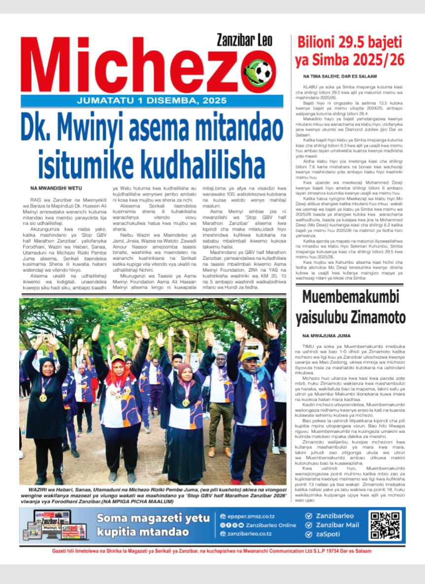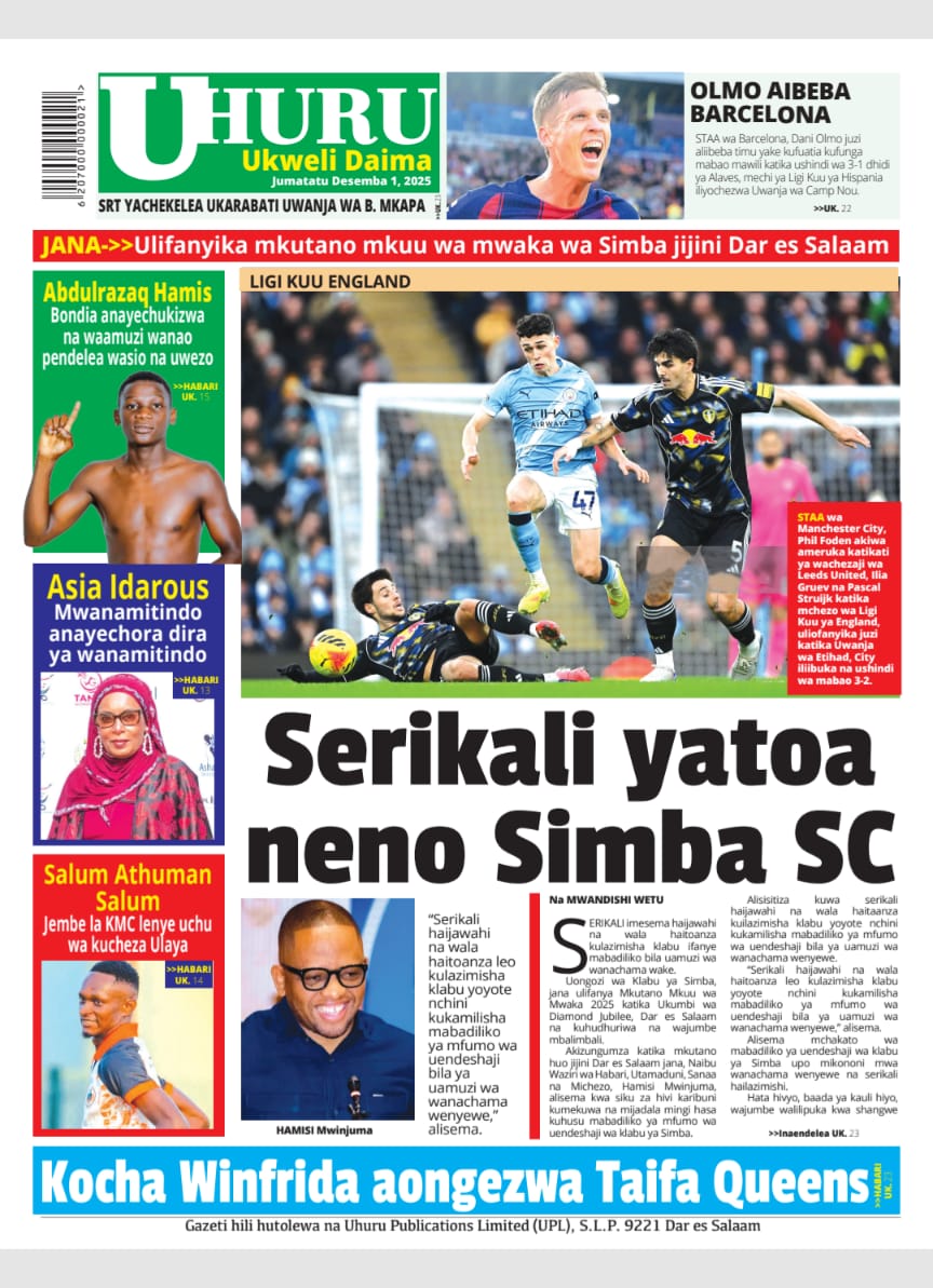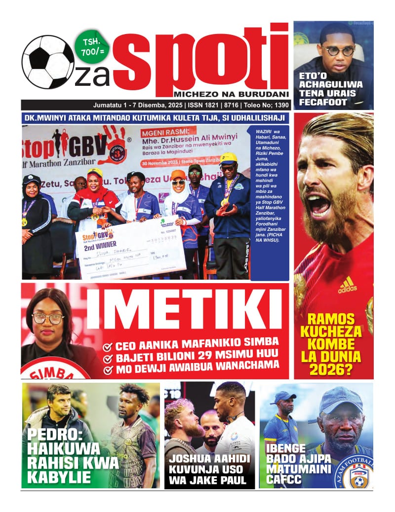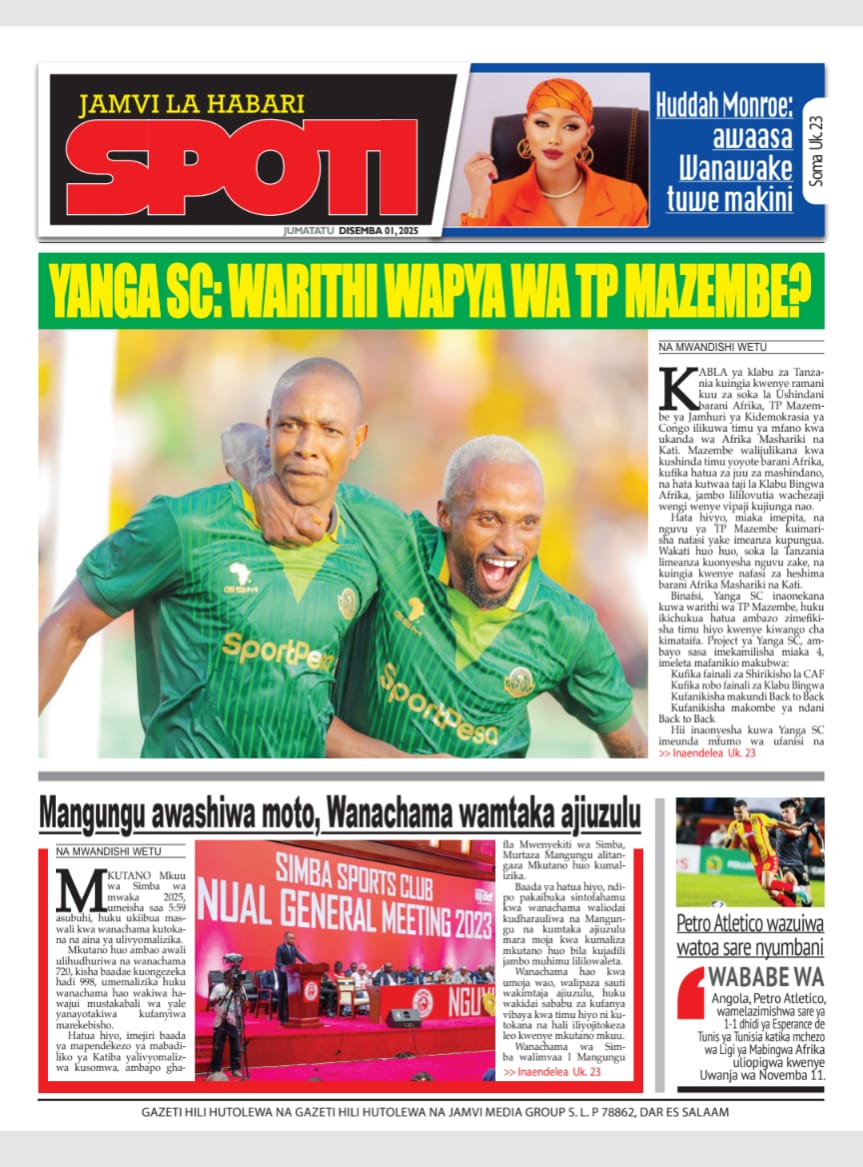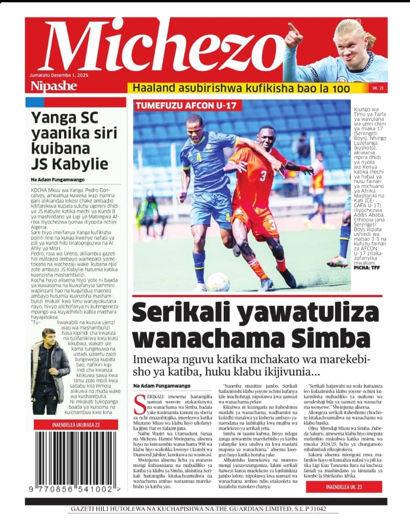 HOME MAGAZETI HABARI KUBWA KWENYE MAGAZETI YA TANZANIA LEO JUMATATU TAREHE 01 DISEMBA, 2025 admin December 1, 2025 Continue Reading Previous: HABARI KUBWA KWENYE MAGAZETI YA TANZANIA LEO JUMANNE TAREHE 25 NOVEMBA, 2025 Leave a Reply Cancel replyYour email address will not be published. Required fields are marked *Comment * Name * Email * Website Save my name, email, and website in this browser for the next time I comment. Δ Related Stories HABARI KUBWA KWENYE MAGAZETI YA TANZANIA LEO JUMANNE TAREHE 25 NOVEMBA, 2025 HOME MAGAZETI HABARI KUBWA KWENYE MAGAZETI YA TANZANIA LEO JUMANNE TAREHE 25 NOVEMBA, 2025 November 25, 2025 WATANO WAFARIKI DUNIA BAADA YA MAGARI MAWILI KUGONGANA 1 min read HOME KITAIFA WATANO WAFARIKI DUNIA BAADA YA MAGARI MAWILI KUGONGANA November 24, 2025 SIMBA SC YAKUBALI KIPIGO NYUMBANI DHIDI YA PETRO ATLETICO DE LUANDA 1 min read HOME MICHEZO NA BURUDANI SIMBA SC YAKUBALI KIPIGO NYUMBANI DHIDI YA PETRO ATLETICO DE LUANDA November 24, 2025