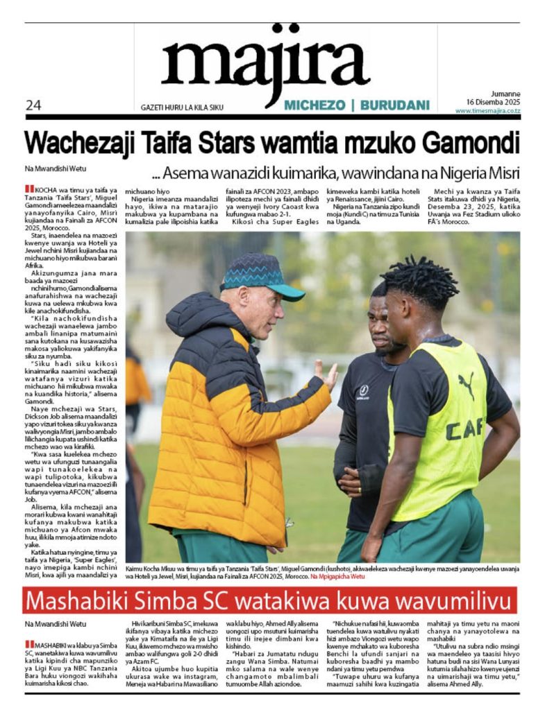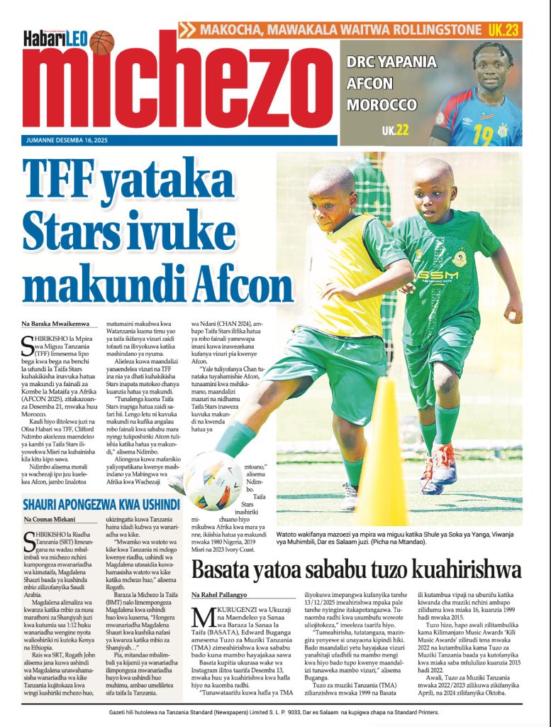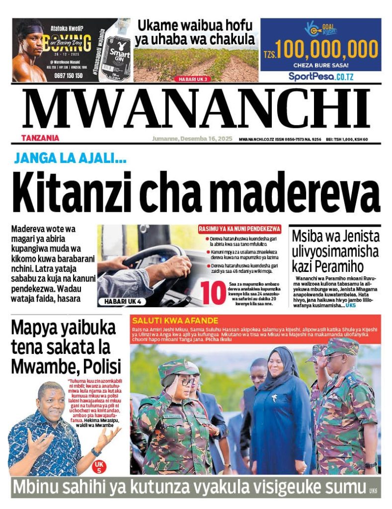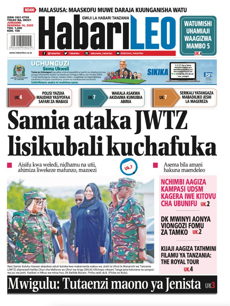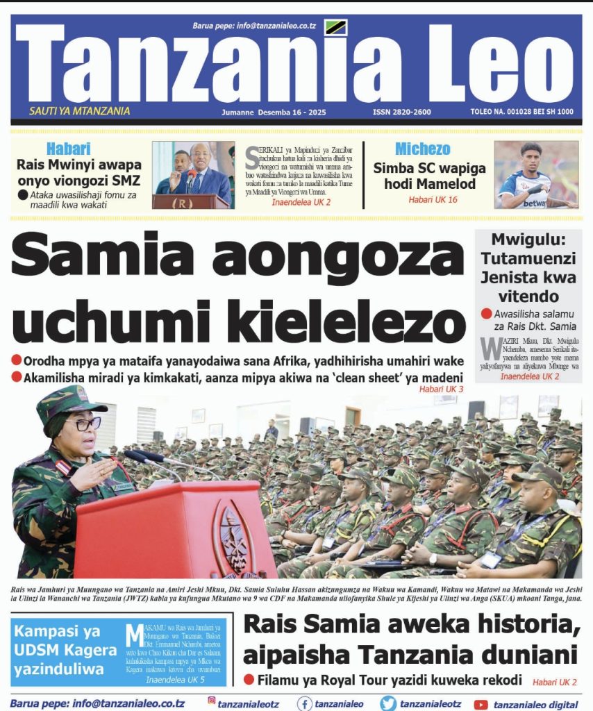 HOME MAGAZETI HABARI KUBWA KWENYE MAGAZETI YA TANZANIA LEO JUMANNE TAREHE 16 DISEMBA, 2025 admin December 16, 2025 Continue Reading Previous: LONDO: AMANI NI MSINGI WA MAENDELEO, JAMII IZINGATIE MAADILI YA BIBLIANext: BALOZI DKT. NCHIMBI AWEKA JIWE LA MSINGI CHUO KIKUU CHA DAR ES SALAAM KAMPASI YA KAGERA Leave a Reply Cancel replyYour email address will not be published. Required fields are marked *Comment * Name * Email * Website Save my name, email, and website in this browser for the next time I comment. Δ Related Stories HABARI KUBWA KWENYE MAGAZETI YA TANZANIA LEO JUMANNE TAREHE 06 JANAURI, 2026 HOME MAGAZETI HABARI KUBWA KWENYE MAGAZETI YA TANZANIA LEO JUMANNE TAREHE 06 JANAURI, 2026 January 6, 2026 WAZIRI SANGU ATETA NA VIONGOZI WA MAKANISA YA KIPENTEKOSTE (CPCT) 1 min read HOME KITAIFA WAZIRI SANGU ATETA NA VIONGOZI WA MAKANISA YA KIPENTEKOSTE (CPCT) December 22, 2025 HABARI KUBWA KWENYE MAGAZETI YA TANZANIA LEO JUMATATU TAREHE 22 DISEMBA, 2025 HOME MAGAZETI HABARI KUBWA KWENYE MAGAZETI YA TANZANIA LEO JUMATATU TAREHE 22 DISEMBA, 2025 December 22, 2025
