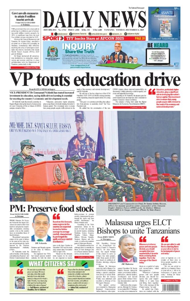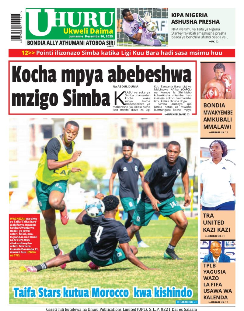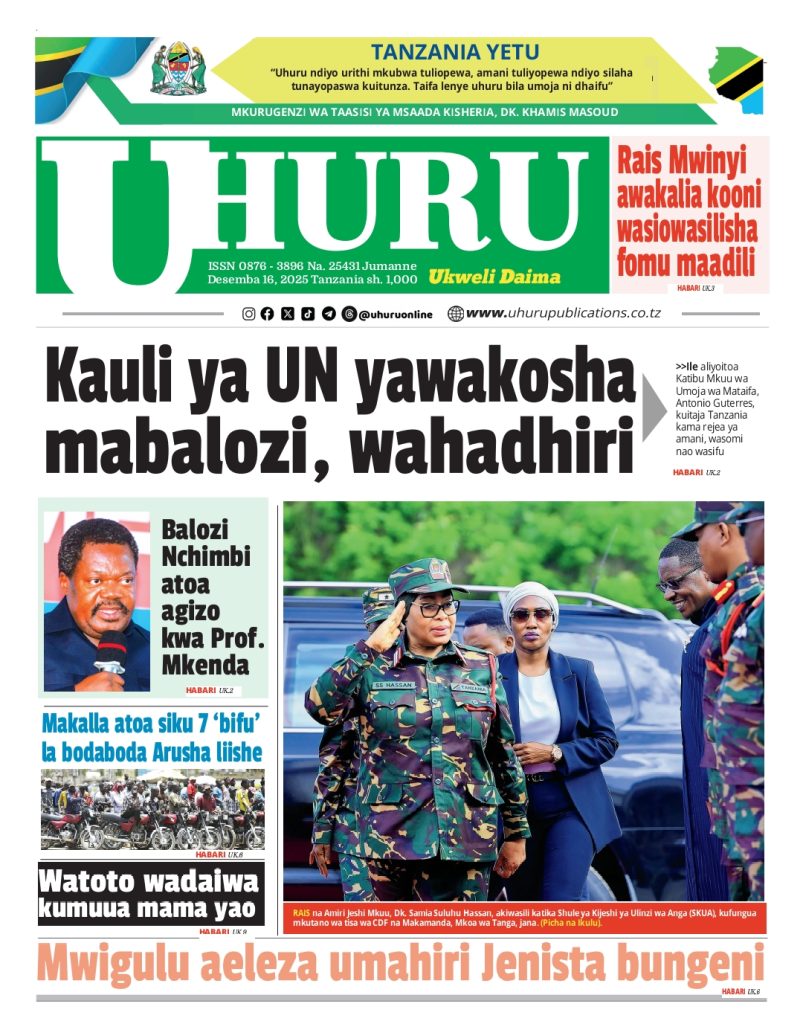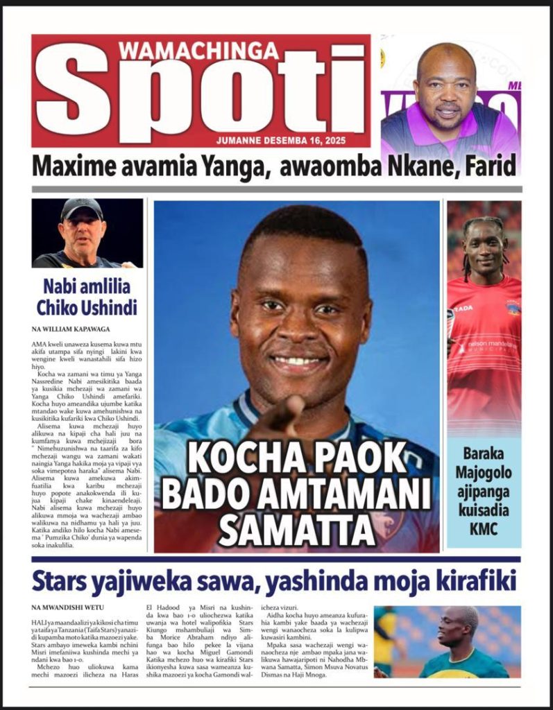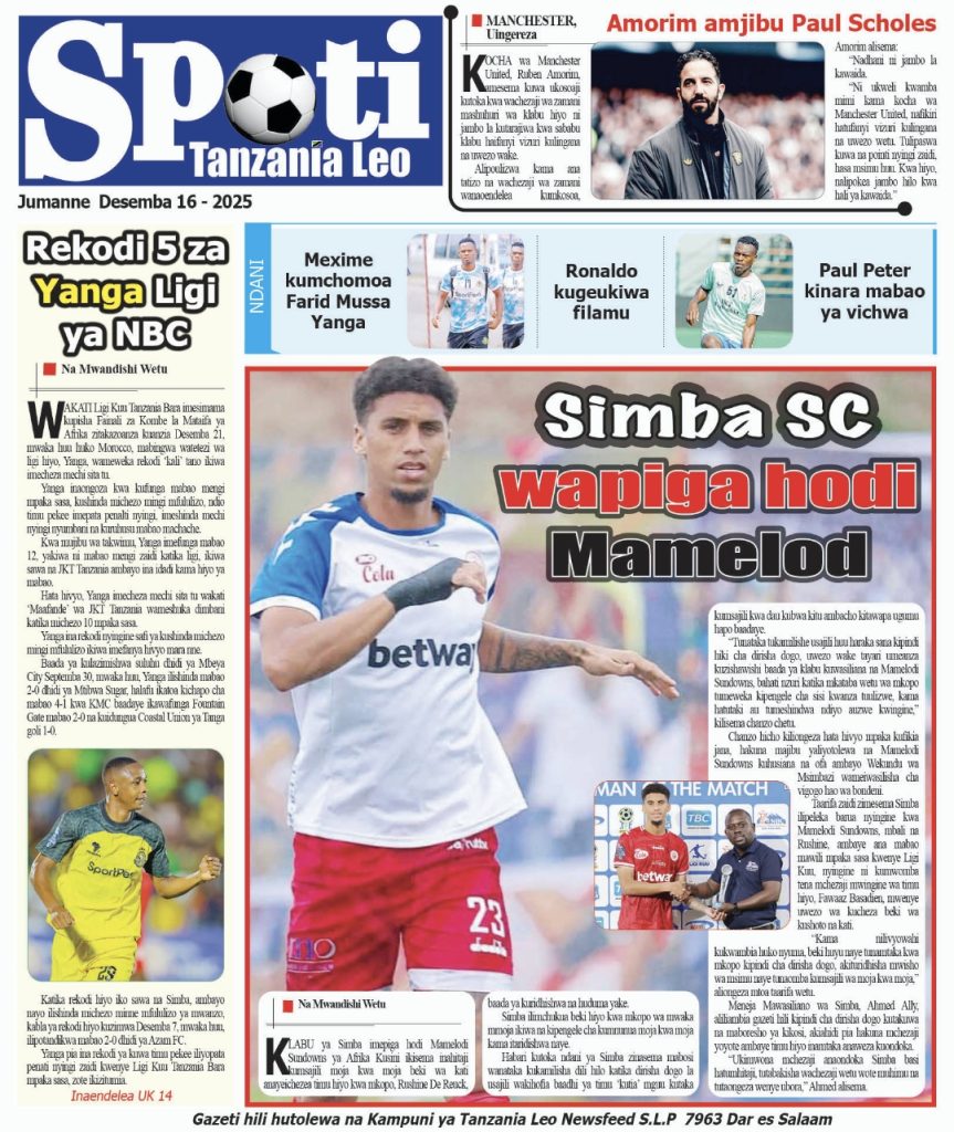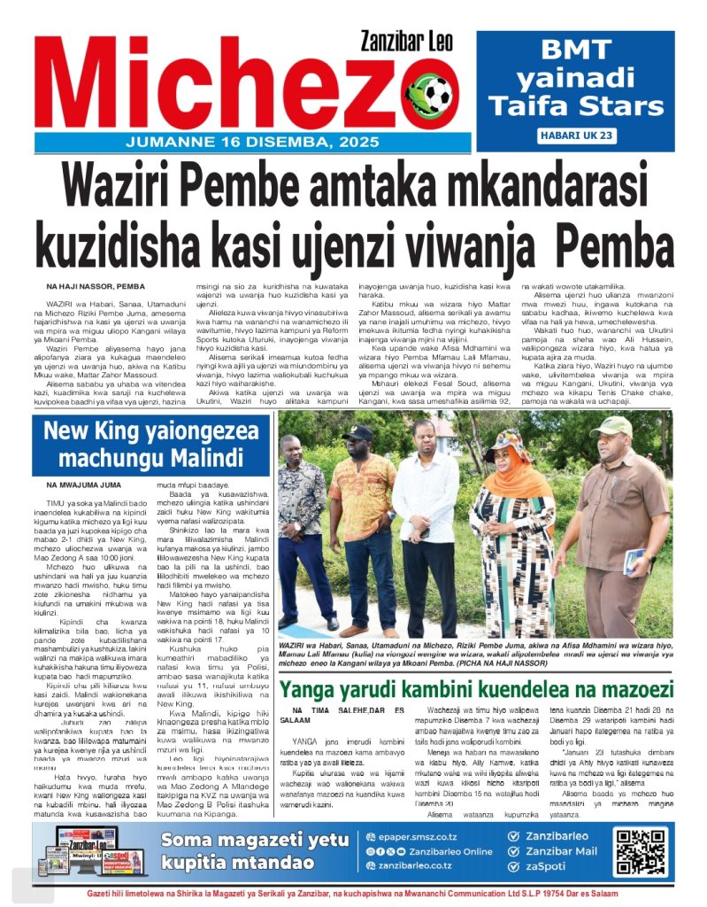 HOME MAGAZETI HABARI KUBWA KWENYE MAGAZETI YA TANZANIA LEO JUMANNE TAREHE 16 DISEMBA, 2025 admin December 16, 2025 Continue Reading Previous: LONDO: AMANI NI MSINGI WA MAENDELEO, JAMII IZINGATIE MAADILI YA BIBLIANext: BALOZI DKT. NCHIMBI AWEKA JIWE LA MSINGI CHUO KIKUU CHA DAR ES SALAAM KAMPASI YA KAGERA Leave a Reply Cancel replyYour email address will not be published. Required fields are marked *Comment * Name * Email * Website Save my name, email, and website in this browser for the next time I comment. Δ Related Stories HABARI KUBWA KWENYE MAGAZETI YA TANZANIA LEO JUMANNE TAREHE 06 JANAURI, 2026 HOME MAGAZETI HABARI KUBWA KWENYE MAGAZETI YA TANZANIA LEO JUMANNE TAREHE 06 JANAURI, 2026 January 6, 2026 WAZIRI SANGU ATETA NA VIONGOZI WA MAKANISA YA KIPENTEKOSTE (CPCT) 1 min read HOME KITAIFA WAZIRI SANGU ATETA NA VIONGOZI WA MAKANISA YA KIPENTEKOSTE (CPCT) December 22, 2025 HABARI KUBWA KWENYE MAGAZETI YA TANZANIA LEO JUMATATU TAREHE 22 DISEMBA, 2025 HOME MAGAZETI HABARI KUBWA KWENYE MAGAZETI YA TANZANIA LEO JUMATATU TAREHE 22 DISEMBA, 2025 December 22, 2025